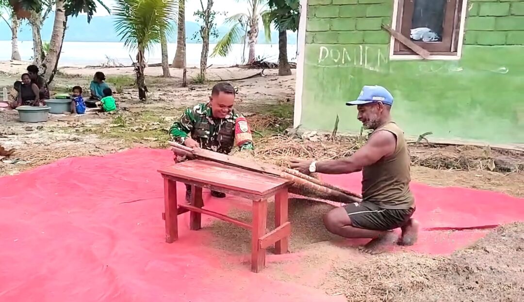 SUPIORI – Babinsa Koramil 1708-06/Supiori Utara, Serka Habel Kopong turun langsung membantu warga membersihkan hasil panen padi dari jerami di Kampung Warsa, Distrik Supiori Utara, Kabupaten Supiori, Papua, Sabtu (18/4/2026).