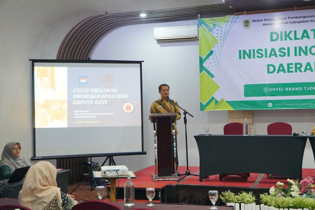 Klaten – Kepala Badan Strategi Kebijakan Dalam Negeri (BSKDN) Kementerian Dalam Negeri (Kemendagri) Yusharto Huntoyungo mengapresiasi Kabupaten Klaten atas pencapaiannya sebagai kabupaten dengan predikat sangat inovatif pada ajang Innovative Government Award (IGA) 2024. Sejalan dengan itu, dia juga menegaskan pentingnya mempertahankan dan meningkatkan capaian tersebut melalui penguatan ekosistem inovasi di daerah.