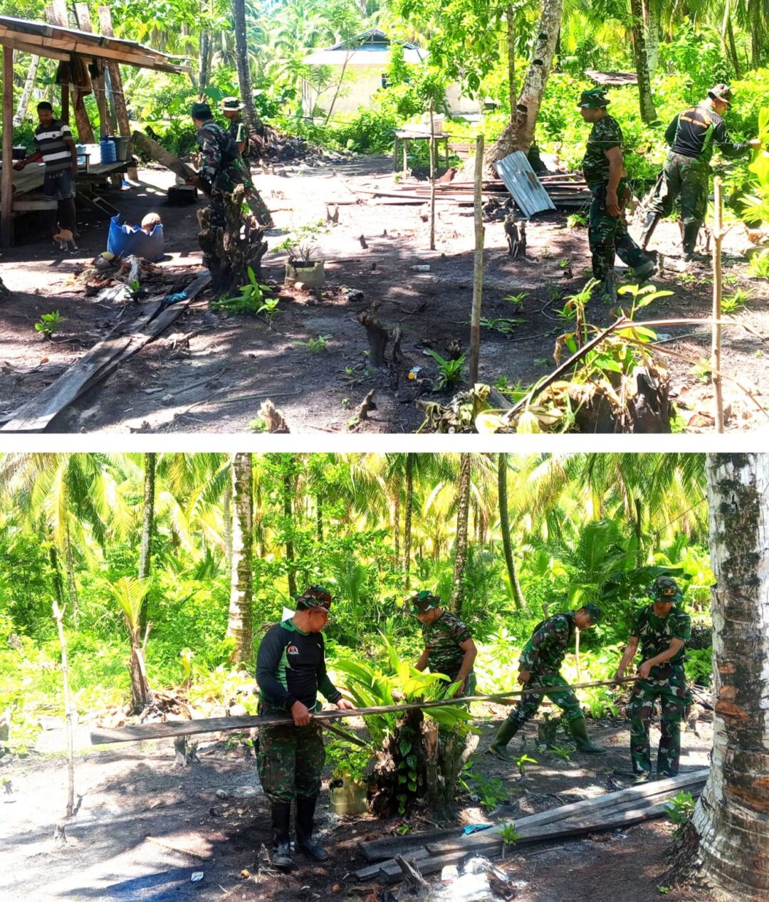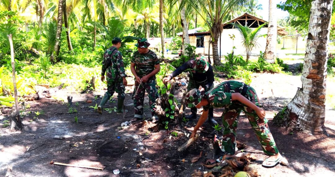 Sejumlah personel Satgas TMMD terlihat bekerjasama membersihkan area yang dipenuhi semak belukar dan sisa-sisa kayu. Mereka juga mengangkat berbagai material yang dapat menghambat proses pembangunan.