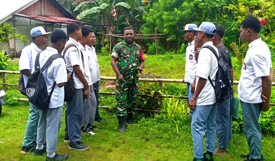 WARSA – Babinsa Posramil 1708-02/Biak Utara-Warsa, Praka Thomas Natai memberikan arahan kepada siswa SMAN 2 Warsa di Kampung Aman, Distrik Warsa, Kabupaten Biak Numfor, Papua, Rabu (22/4/2026).