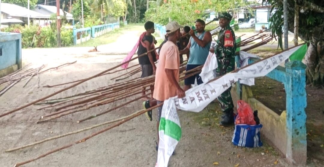 NUMFOR – Babinsa Koramil 1708-05/Numfor Sertu Ferdinand Kmur aktif turun langsung membantu warga memasang umbul-umbul dan bendera dalam rangka menyambut HUT ke-55 Jemaat GKI Imanuel Amberparem sekaligus Hari Raya Paskah di Kampung Amberparem, Distrik Buryadori, Kabupaten Biak Numfor, Papua, Rabu (25/3/2026).
