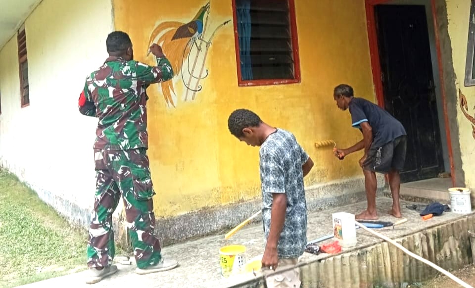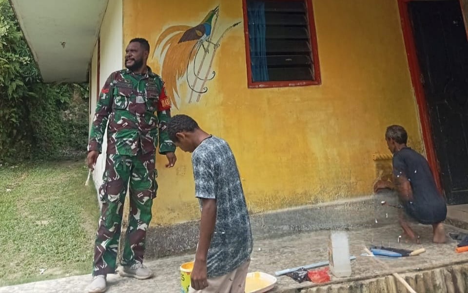 NAPDORI – Babinsa Koramil 1708-03/Biak Barat, Kopda Beni Nap bersama warga melaksanakan pengecatan rumah milik Nataniel Nap di Desa Napdori, Distrik Swandiwe, Kabupaten Biak Numfor, Papua, Minggu (30/11/2025).