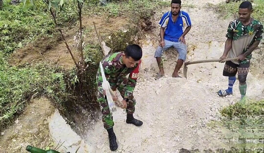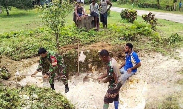 Babinsa Biak Kota Bantu Warga Binaan Menggali Karang Timbunan