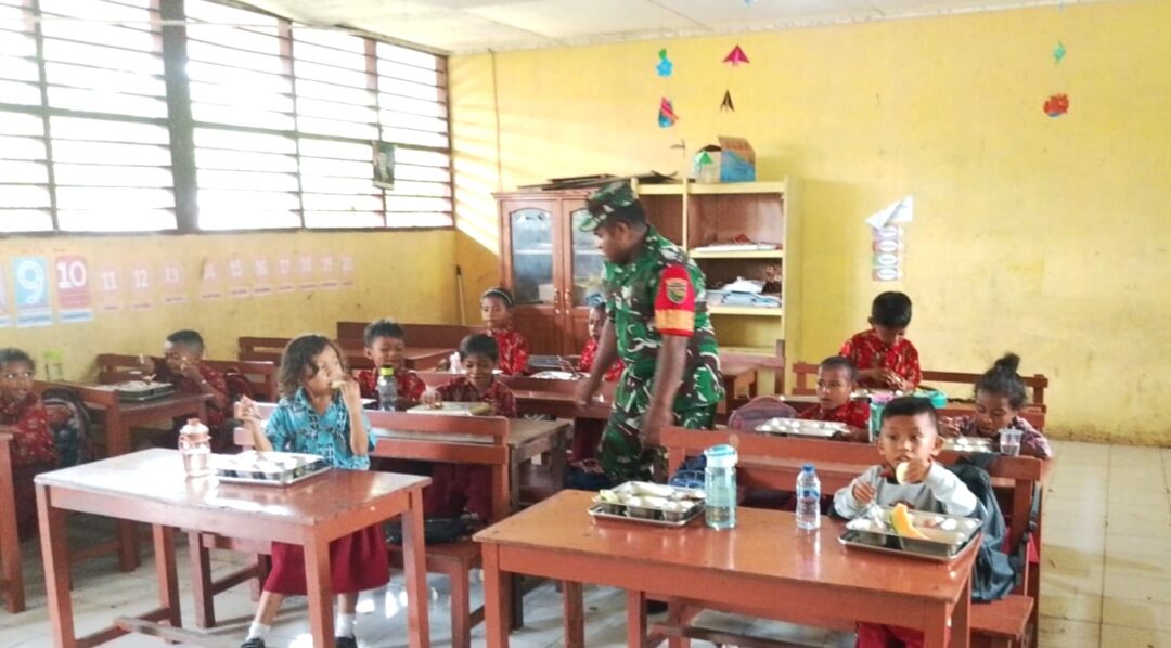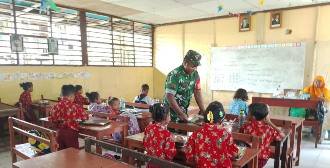 Pratu Lemuel ikut dampingi pembagian makanan bergizi di SD Inpres Yafdas. (Foto: Penerangan Kodim 1708/BN)