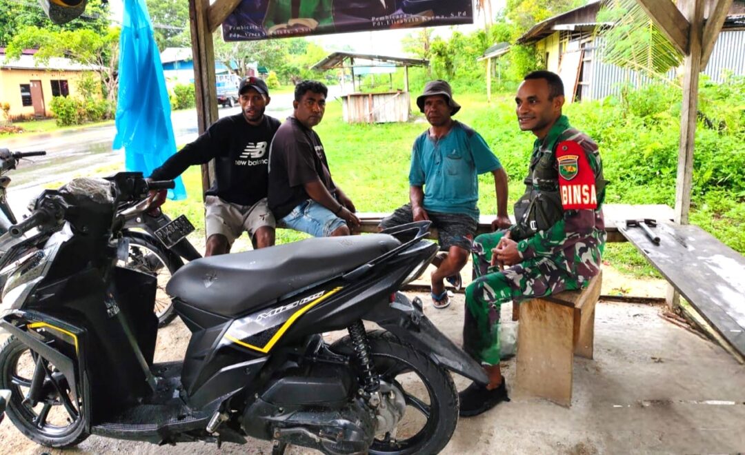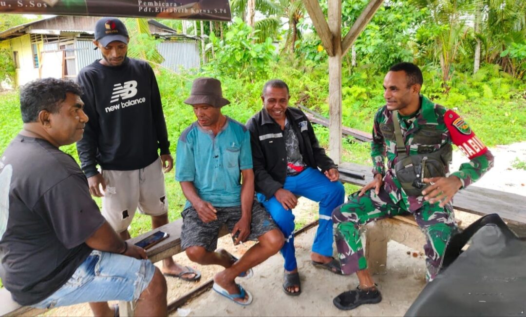 Pratu Barens Wasanggai jalin komunikasi bersama warga dalam perkembangan di lingkungan wilayah binaan. (Foto: Penerangan Kodim 1708/BN)