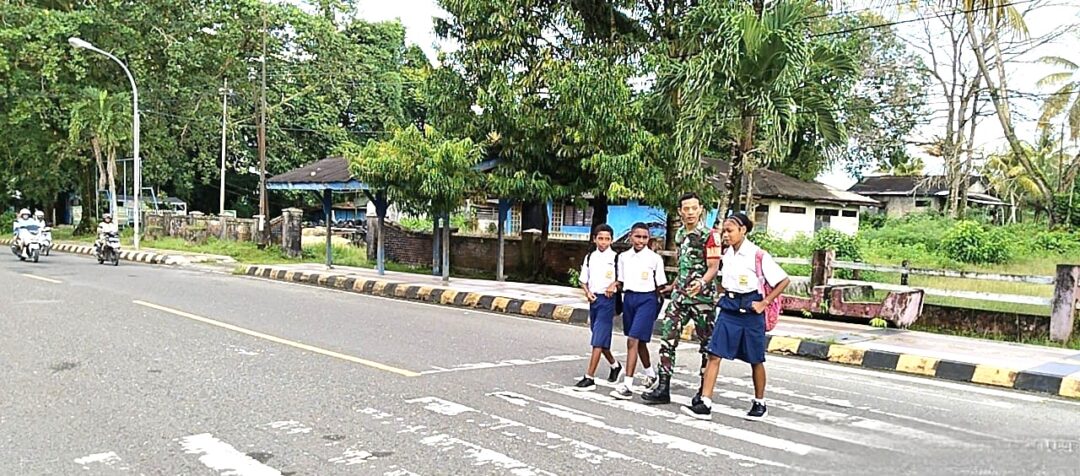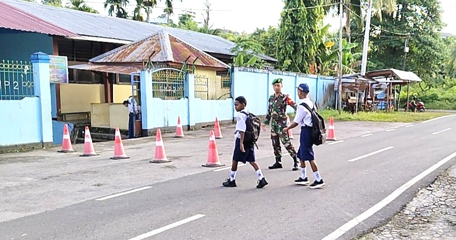 BIAK – Babinsa Koramil 1708-01/Biak Kota, Serka Mudho Wibowo dan Serka Sriyono membantu menyeberangkan anak-anak sekolah di kawasan padat lalu lintas di sekitar SMP Negeri (SMPN) 2 Karang Mulia dan SMP YPK Rut Yenures, Distrik Samofa, Kelurahan Karang Mulia, Kabupaten Biak Numfor, Papua, Selasa (6/1/2026).