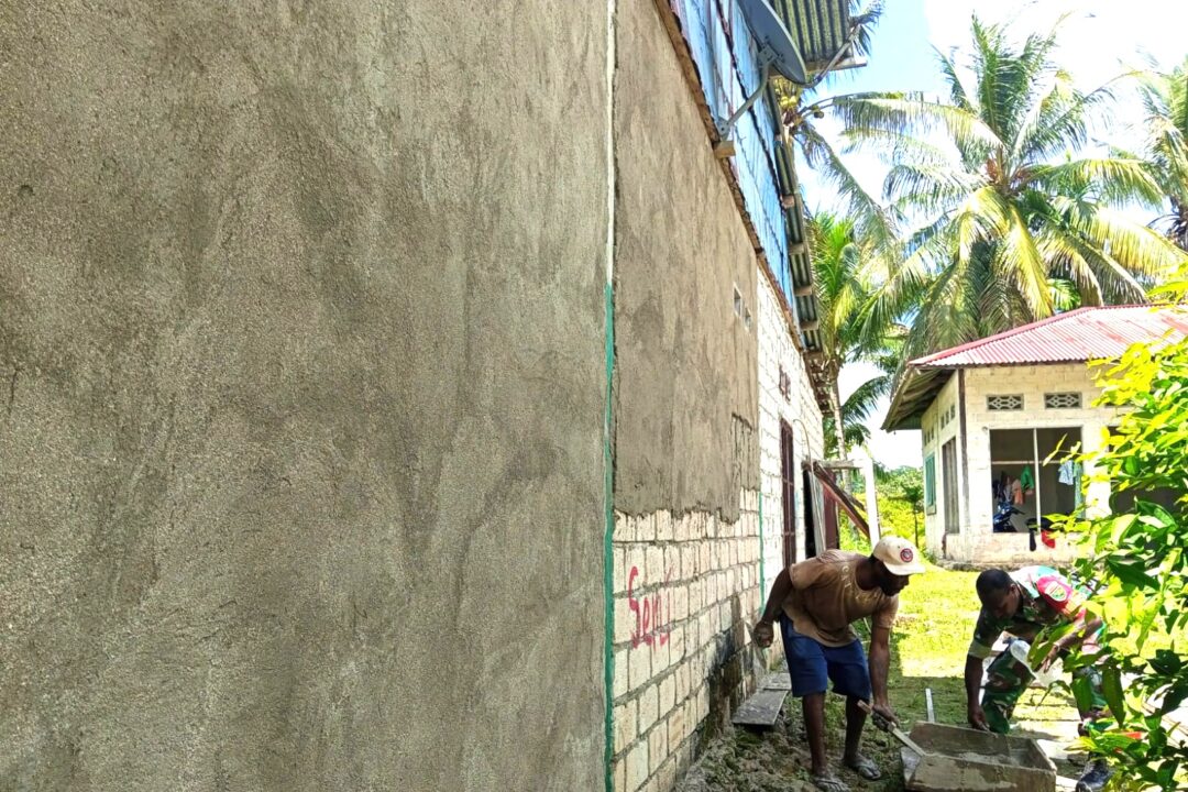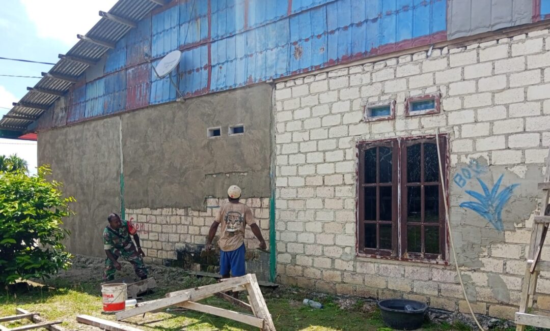BIAK – Babinsa Koramil 1708-01/BK Posramil 01 Biak Timur, Sertu Nahor Awete membantu plester dinding rumah milik Yan Kurni di Kampung Insumarires, Distrik Biak Timur, Kabupaten Biak Numfor, Papua, Kamis (23/4/2026).