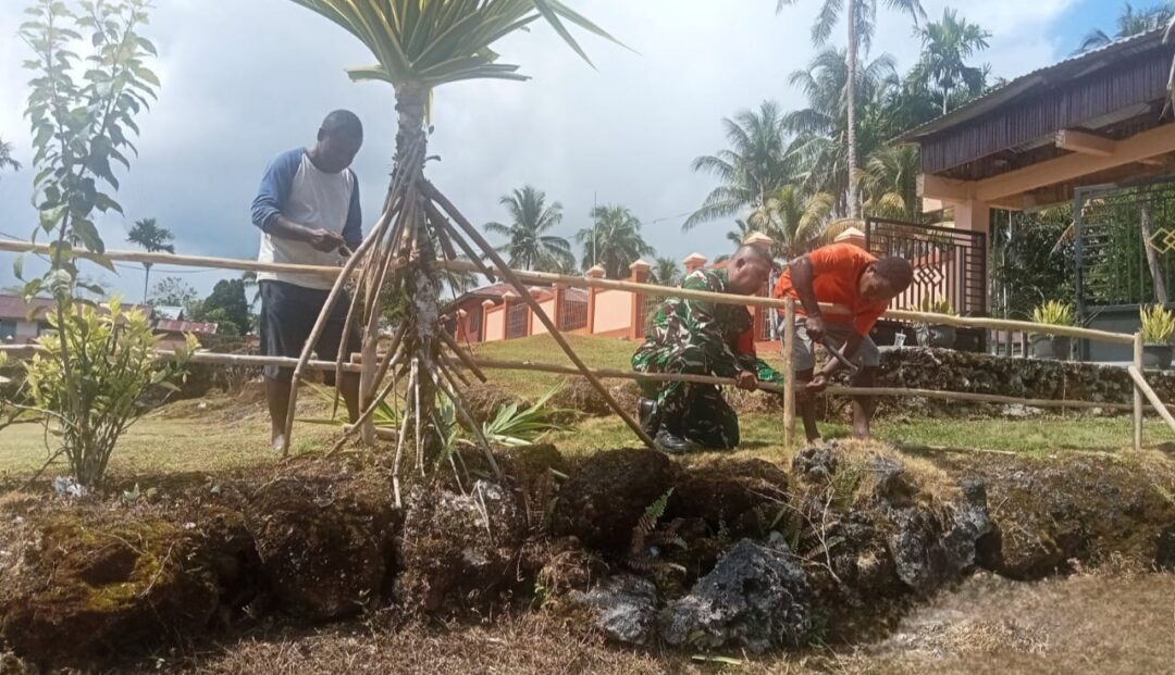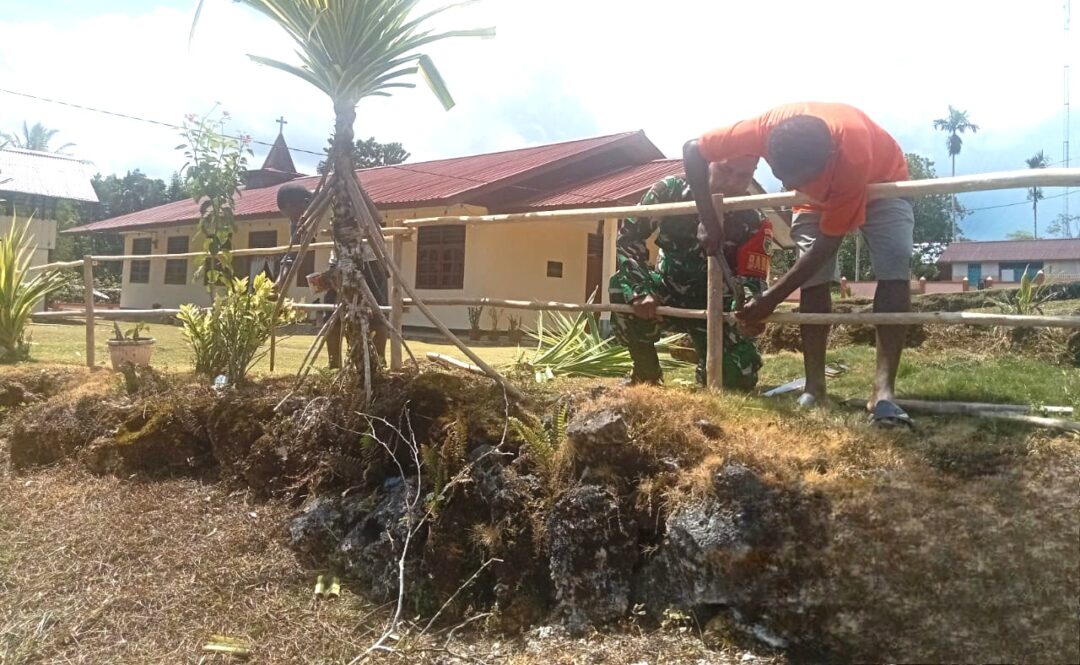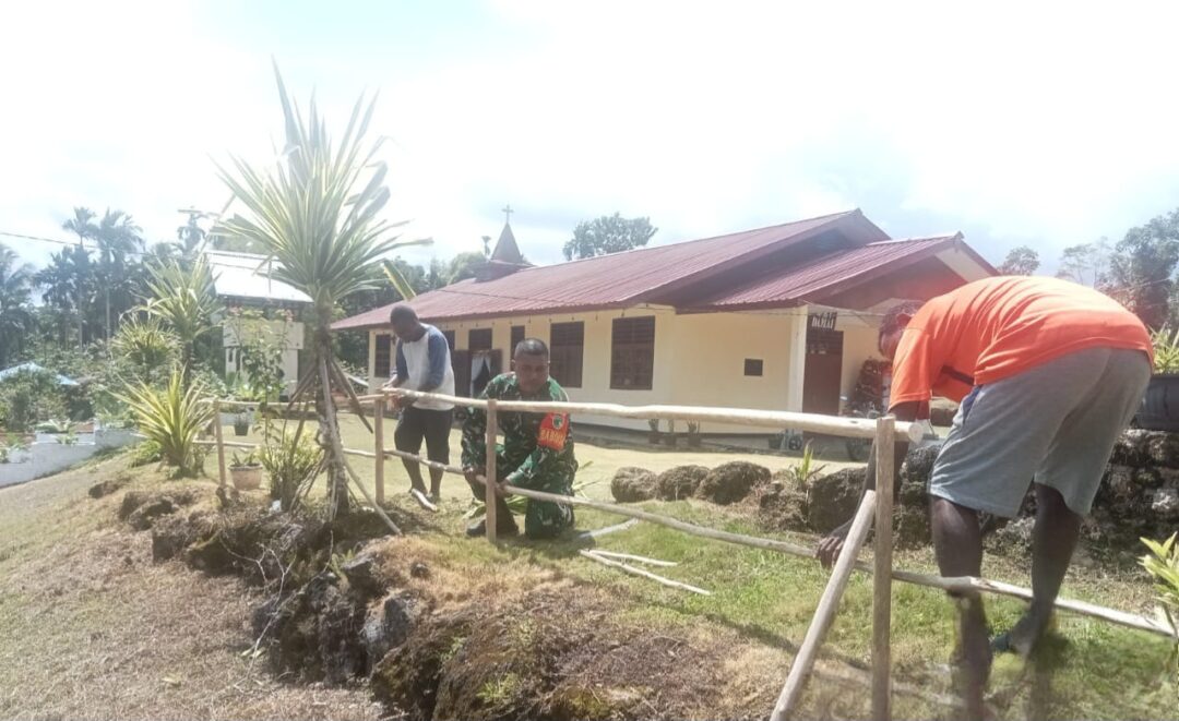 Babinsa Biak Utara Bantu Warga Jemaat Damai Nermnu Bangun Pagar Jalan Masuk Gereja