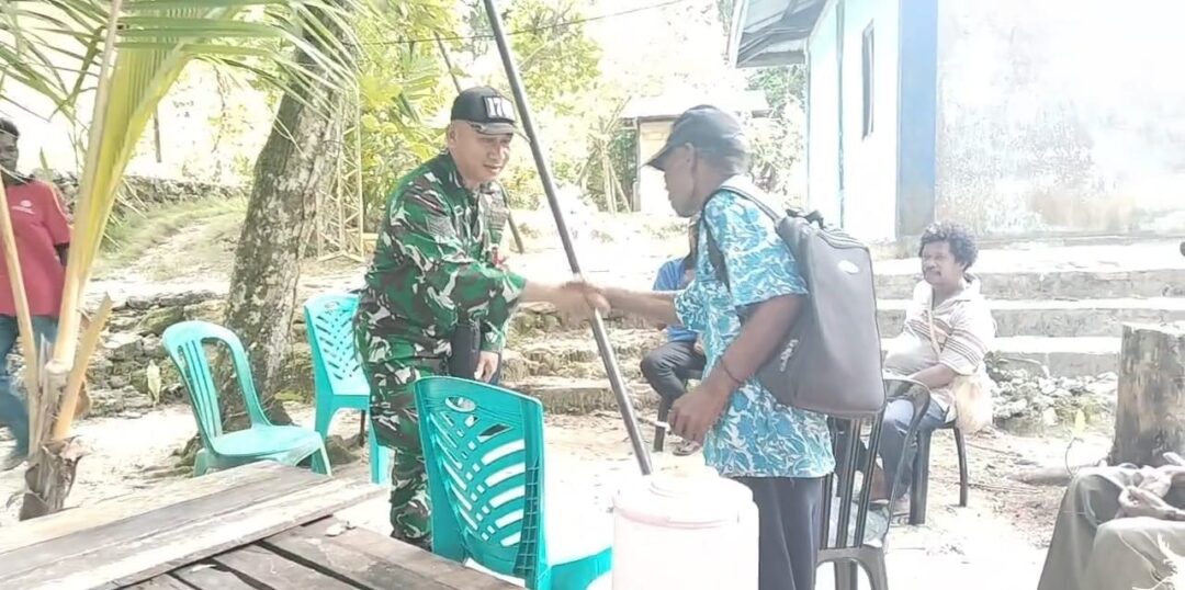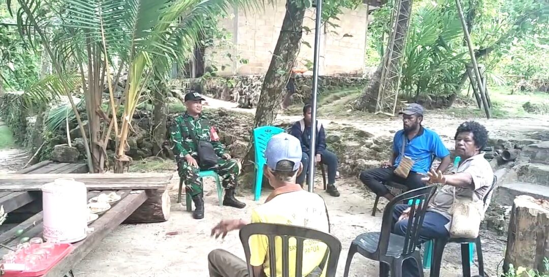 SUPIORI UTARA – Babinsa Koramil 1708-06/Supiori Utara, Serka Agustinus Ganna komunikasi sosial (komsos) bersama warga di halaman rumah keluarga Adokor, Kampung Warsa, Distrik Supiori Utara, Kabupaten Supiori, Papua, Sabtu (24/01/2026).