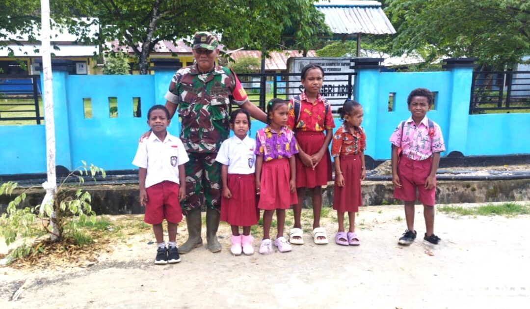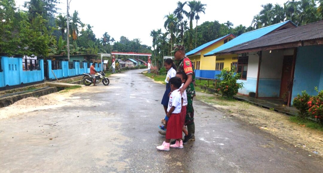 Babinsa Supiori Selatan Bantu Menyeberangi Anak Sekolah di Jalan Raya