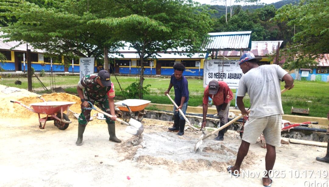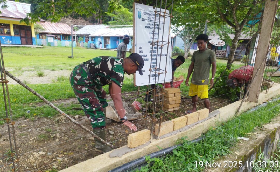 WARSA – Upaya mendukung percepatan pembangunan pagar sekolah dasar (SD) di wilayah binaannya, Babinsa Koramil 1708-04/Supiori Selatan, Serda Sudirman, turut membantu warga melakukan pencampuran semen untuk pembangunan pagar SD di Kampung Odori, Distrik Supiori Selatan, Kabupaten Supiori, Papua, Rabu (19/11/2025).