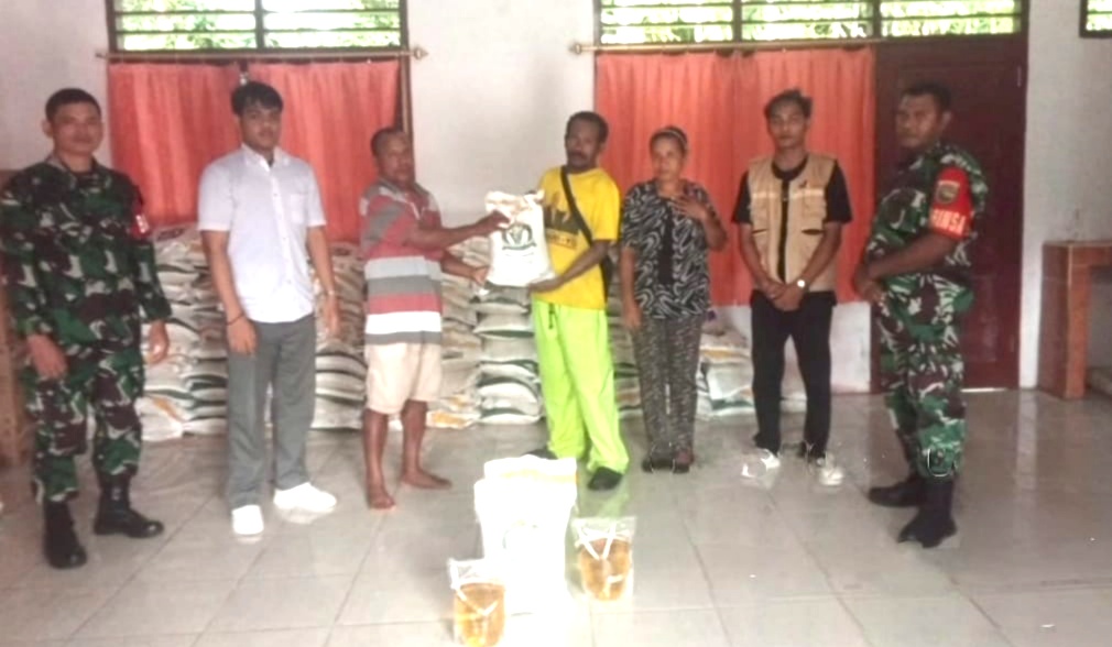 SUPIORI – Dalam rangka mendukung kelancaran program pemerintah dalam penyaluran bantuan pangan, Babinsa Koramil 1708-04/Supiori Selatan, Sertu Yunus Upa Rante bersama Serda Hofni Padwa melaksanakan pendampingan dan pengawasan pendistribusian bantuan beras dan minyak goreng kepada masyarakat Kampung Yawerma, Distrik Supiori Timur, Kabupaten Supiori, Papua, Sabtu (6/12/2025).