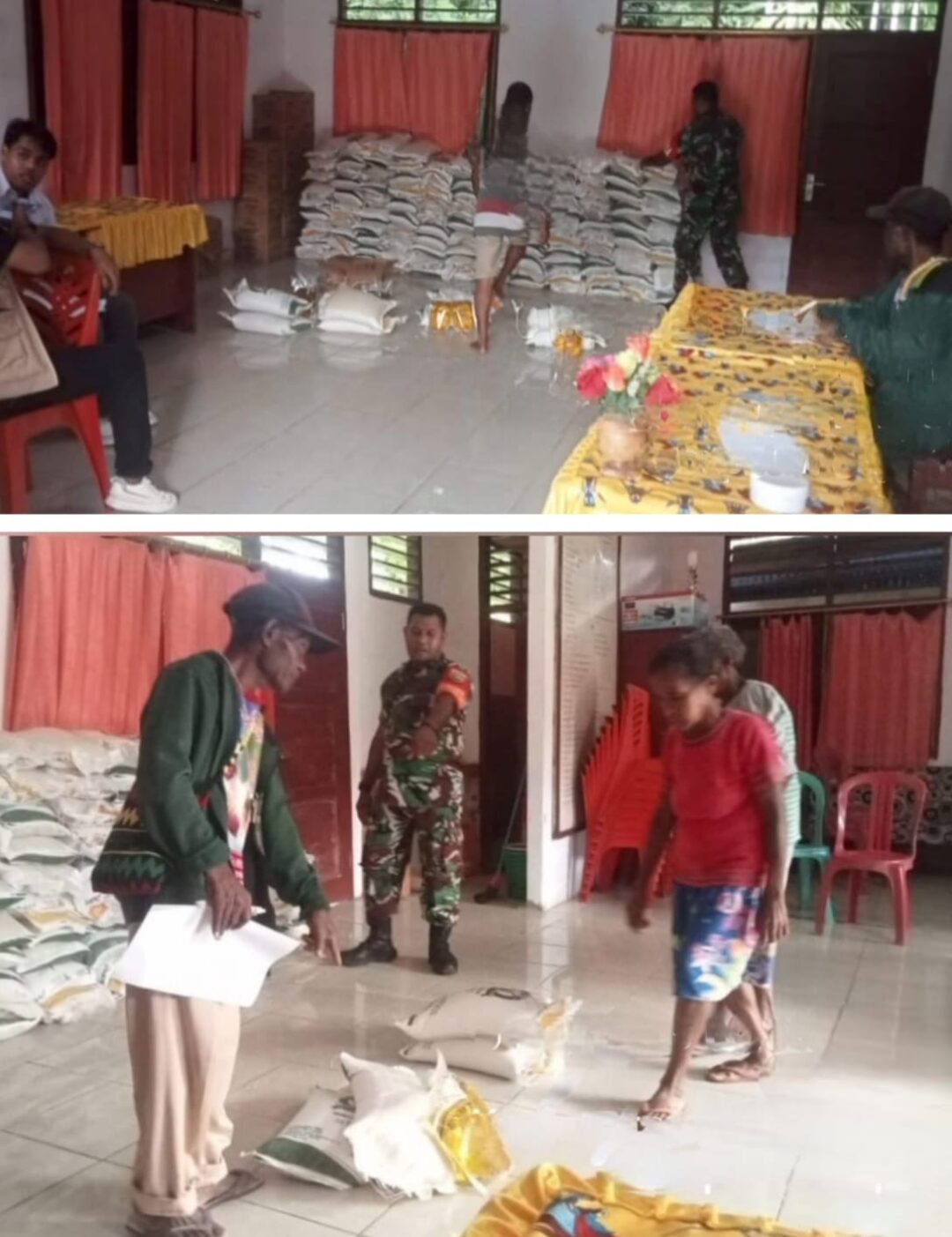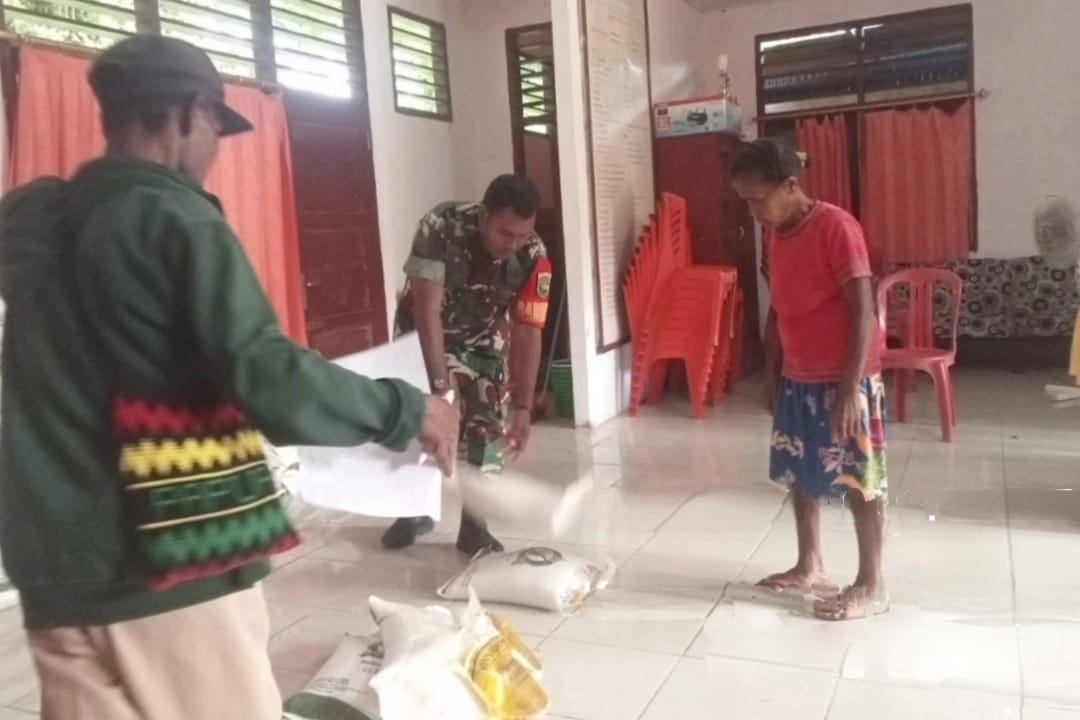 Personel Babinsa Koramil Supiori Selatan dampingi distribusi bantuan beras. (Foto: Penerangan Kodim 1708/BN)
