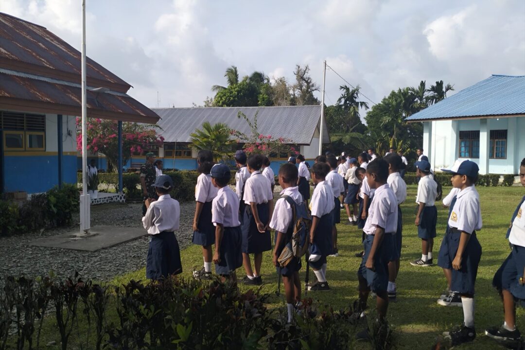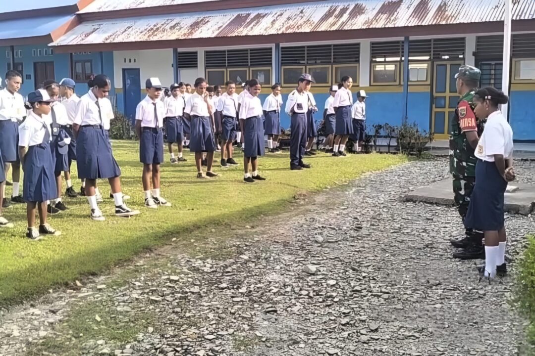 SUPIORI – Babinsa Koramil 1708-04/Supiori Selatan Serka Semmi Uhing memimpin kegiatan apel pagi bagi siswa-siswi SMP YPK I Korido yang berlangsung di lingkungan sekolah, Kampung Fanindi, Distrik Supiori Selatan, Kabupaten Supiori, Selasa (20/1/2026).