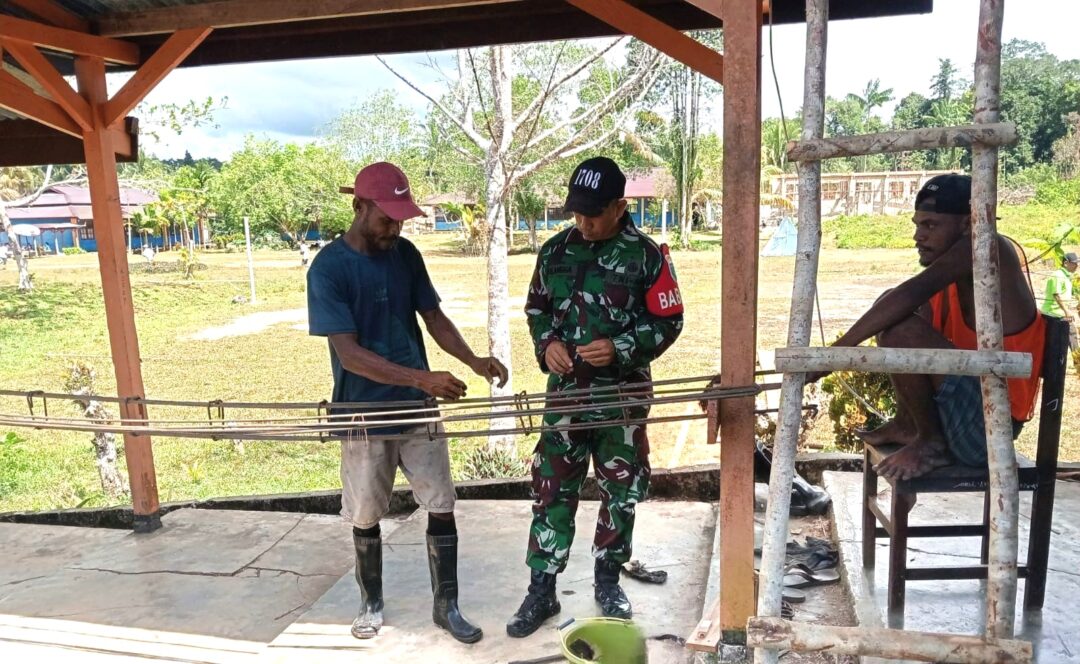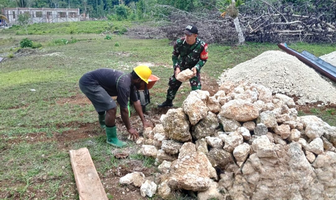 SUPIORI UTARA – Babinsa Kampung Puweri, Sertu Abraham Tunliu menyempatkan diri membantu masyarakat di wilayah binaannya yang sedang melaksanakan perehaban SD YPK Pudori di Desa Puweri, Distrik Supiori Utara, Kabupaten Supiori, Papua, Sabtu (13/12/2025).