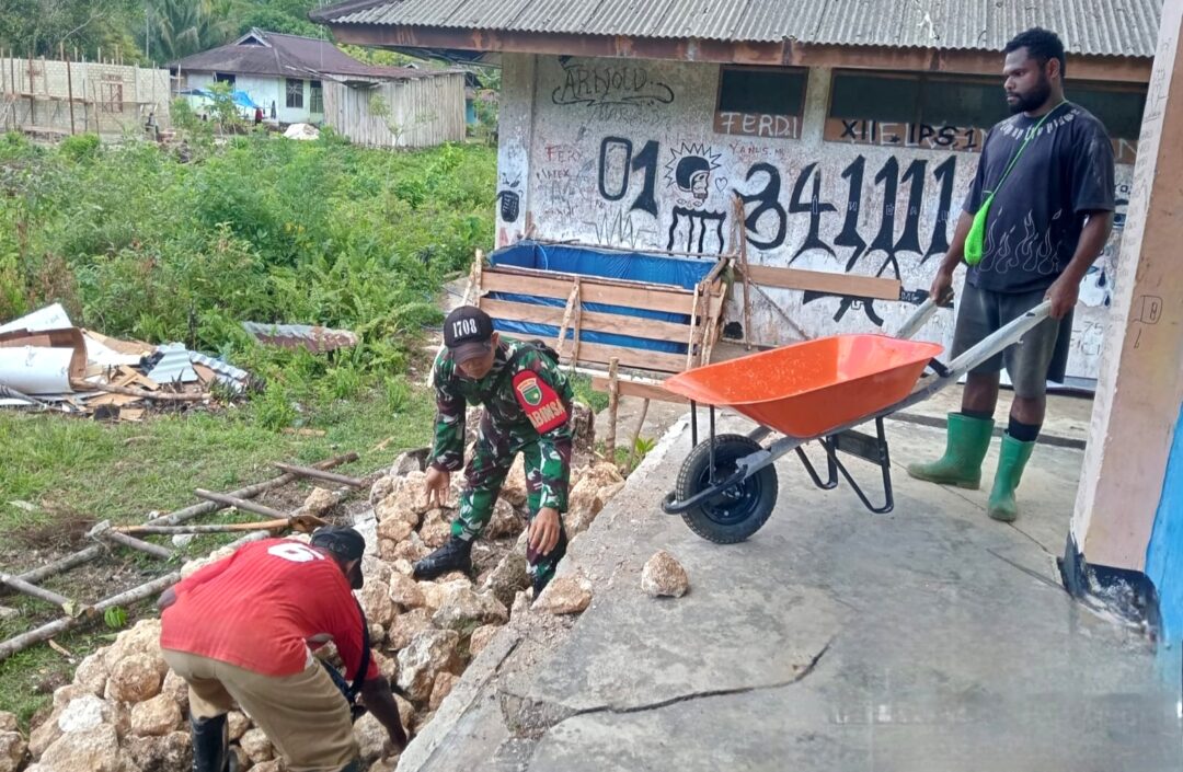 BANTU: Babinsa Kampung Puweri, Sertu Abraham Tunliu bantu masyarakat di wilayah binaannya saat perehaban SD YPK Pudori di Desa Puweri, Distrik Supiori Utara, Kabupaten Supiori, Sabtu (13/12/2025). (Foto: Penerangan Kodim 1708/BN)