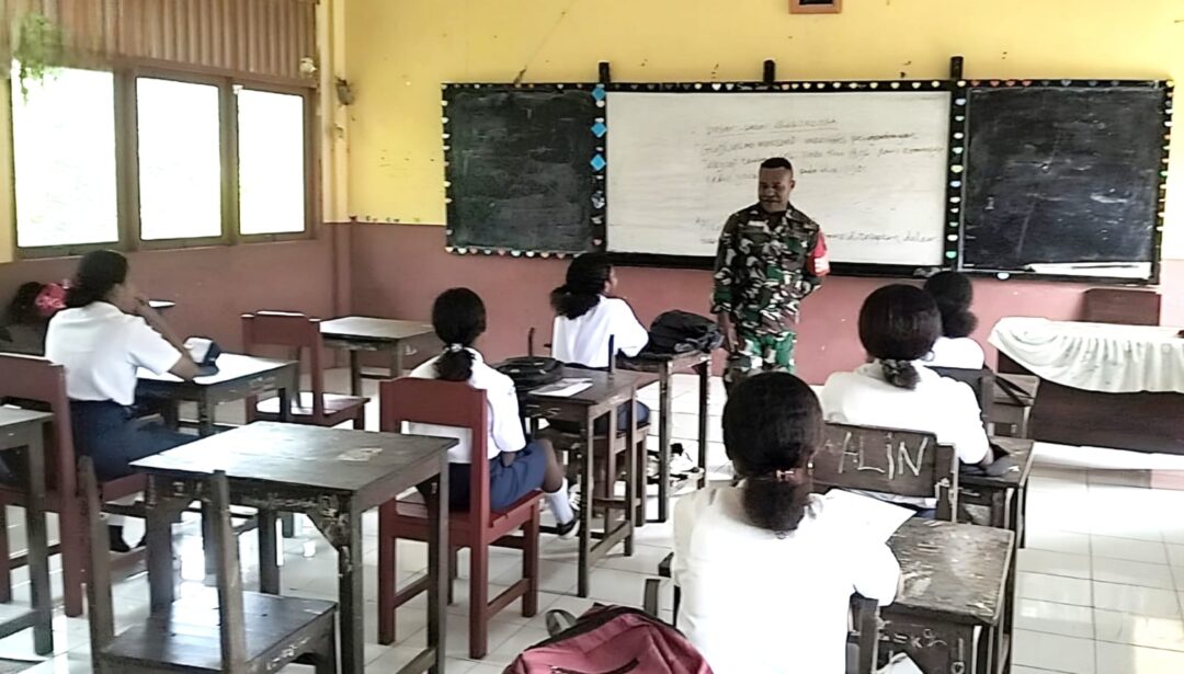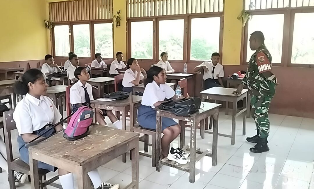 BIAK UTARA – Babinsa Koramil 1708-02/Biak Utara Serda Wetipo memberikan materi Wawasan Kebangsaan (wasbang) dan Cinta Tanah Air kepada siswa-siswi SMP Negeri (SMPN) 1 Biak Utara di Kampung Rosayendi, Distrik Biak Utara, Kabupaten Biak Numfor, Papua, Selasa (10/2/2026).