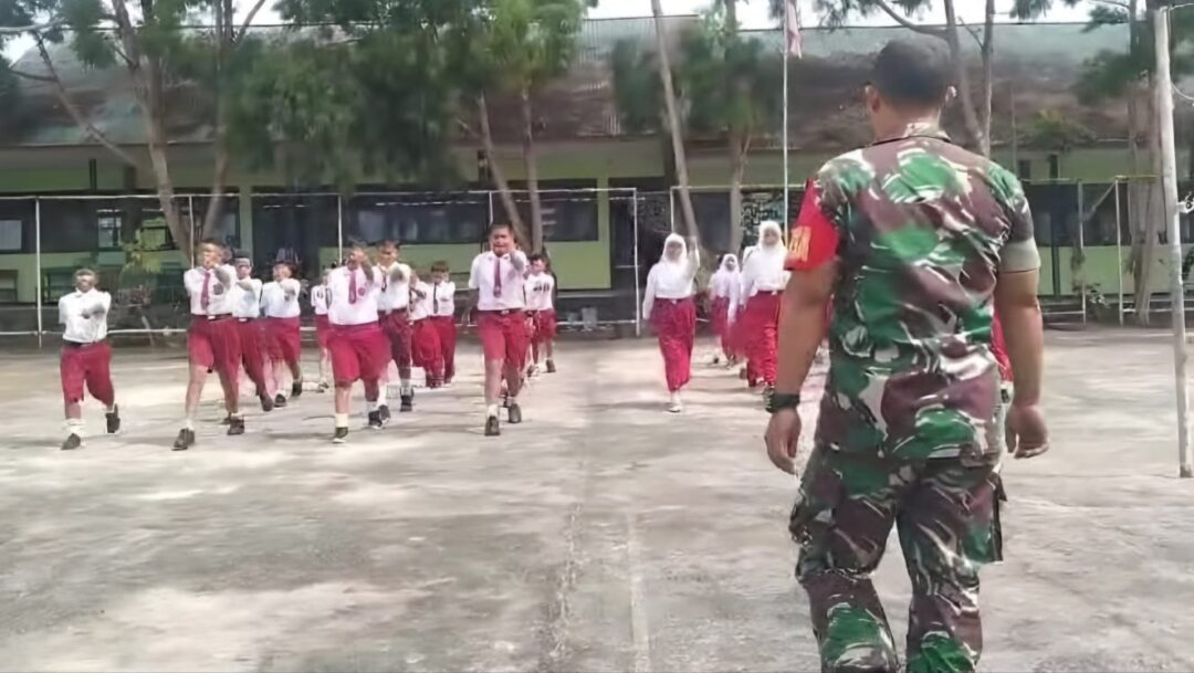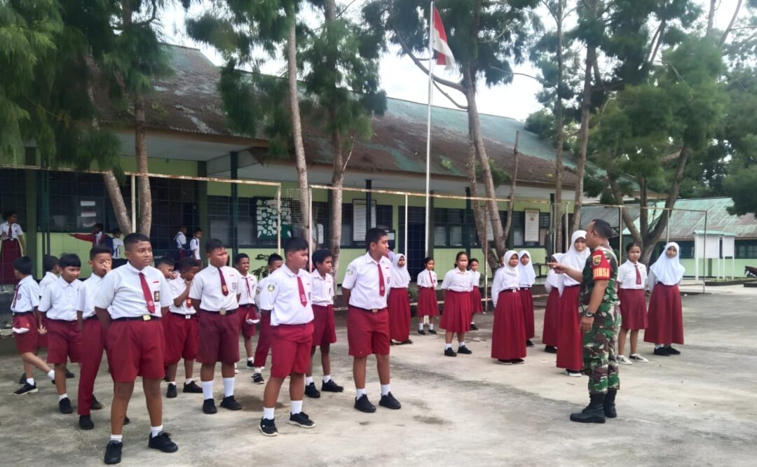 BIAK – Babinsa Koramil 1708-01/Biak Kota, Serda Agus Bintara melaksanakan kegiatan pelatihan Peraturan Baris Berbaris (PBB), sekaligus memberikan materi wawasan kebangsaan (wasbang) kepada murid-murid SD Kartika di Kelurahan Brambaken, Distrik Samofa, Kabupaten Biak Numfor, Papua, Selasa (9/9/2025).