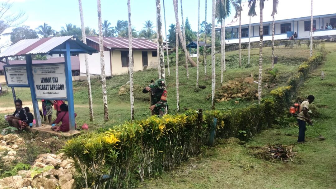 BIAK BARAT – Babinsa Koramil 1708-03/Biak Barat Kopda Michael Samosir bersama masyarakat melaksanakan kegiatan kerja bakti membersihkan pekarangan Gereja GKI Nazareth di Kampung Benggor, Distrik Biak Barat, Kabupaten Biak Numfor, Papua, Minggu (14/9/2025).