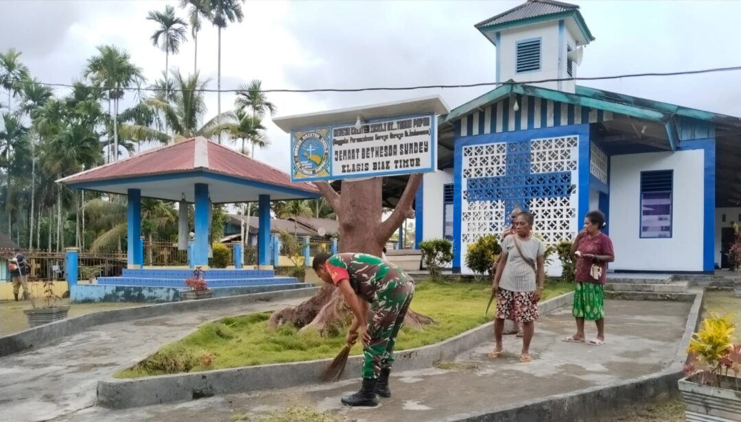 BIAK TIMUR – Sebagai bentuk kepedulian terhadap kebersihan lingkungan dan tempat ibadah, Babinsa Posramil 1708-01/Biak Timur, Serda Aljabar Mansoben bersama Kopka Yosep K. Silaka menggelar kegiatan gotong-royong membersihkan halaman Gereja GKI Betesda Sundey di Kampung Sundey, Distrik Biak Timur, Kabupaten Biak Numfor, Papua, Selasa (24/3/2026).