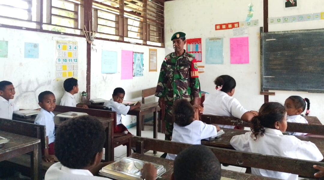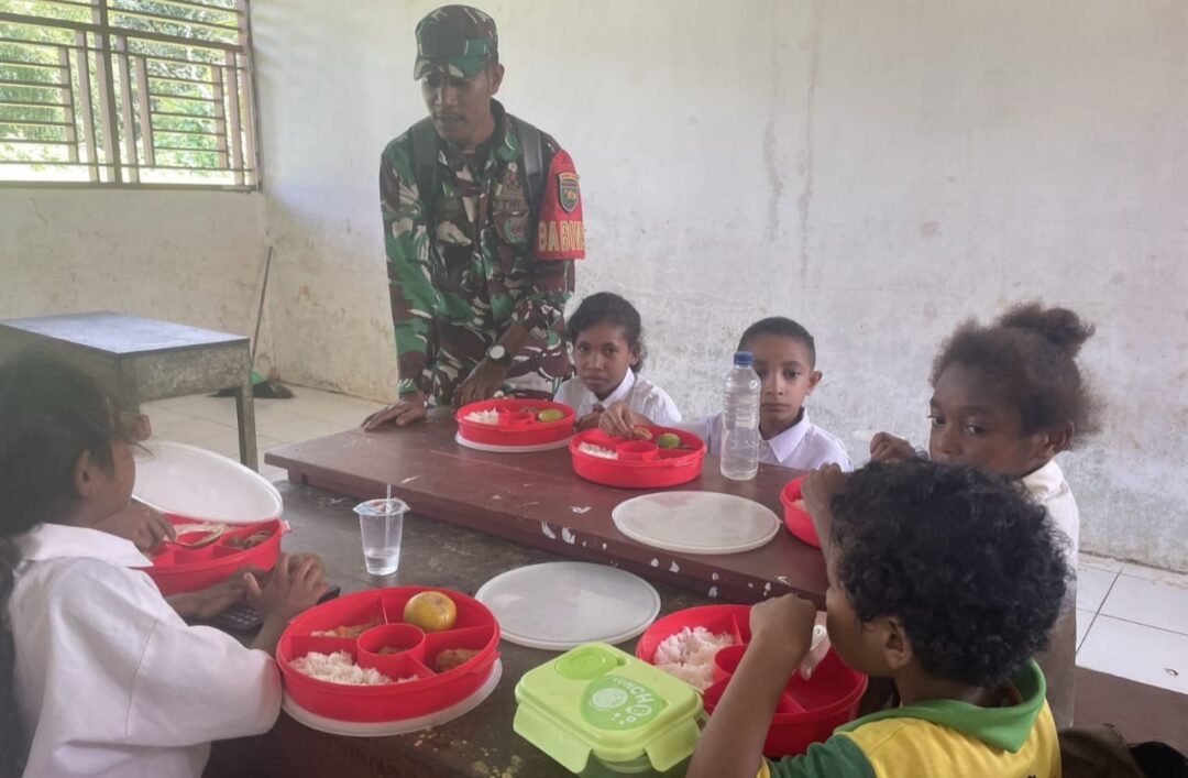 Kegiatan pendampingan tersebut dilaksanakan oleh Sertu Petrus Mandosir bersama Babinsa lainnya sebagai bentuk kepedulian terhadap kesehatan dan pemenuhan gizi anak-anak di lingkungan sekolah.