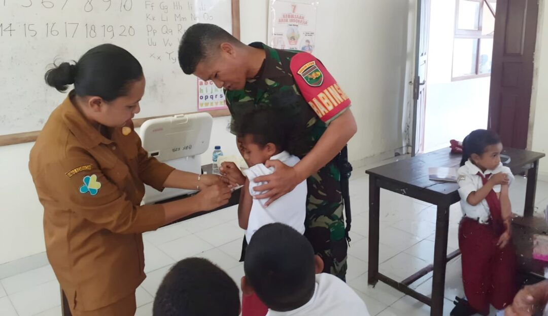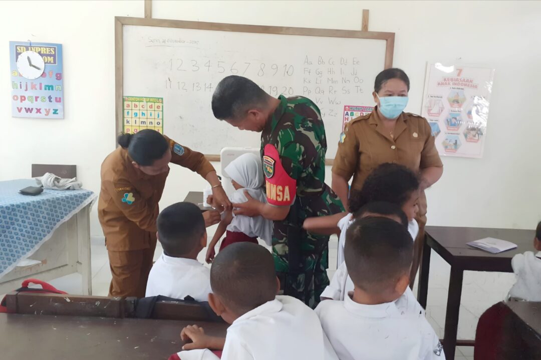 BIAK – Dalam rangka mendukung program pemerintah di bidang kesehatan, khususnya imunisasi bagi anak sekolah, Babinsa Koramil 1708-01/Biak Kota Sertu Andri Syah turut mendampingi pelaksanaan Bulan Imunisasi Anak Sekolah (BIAS) di SD Inpres Saramom, Distrik Biak Kota, Kabupaten Biak Numfor, Papua, Selasa (25/11/2025).