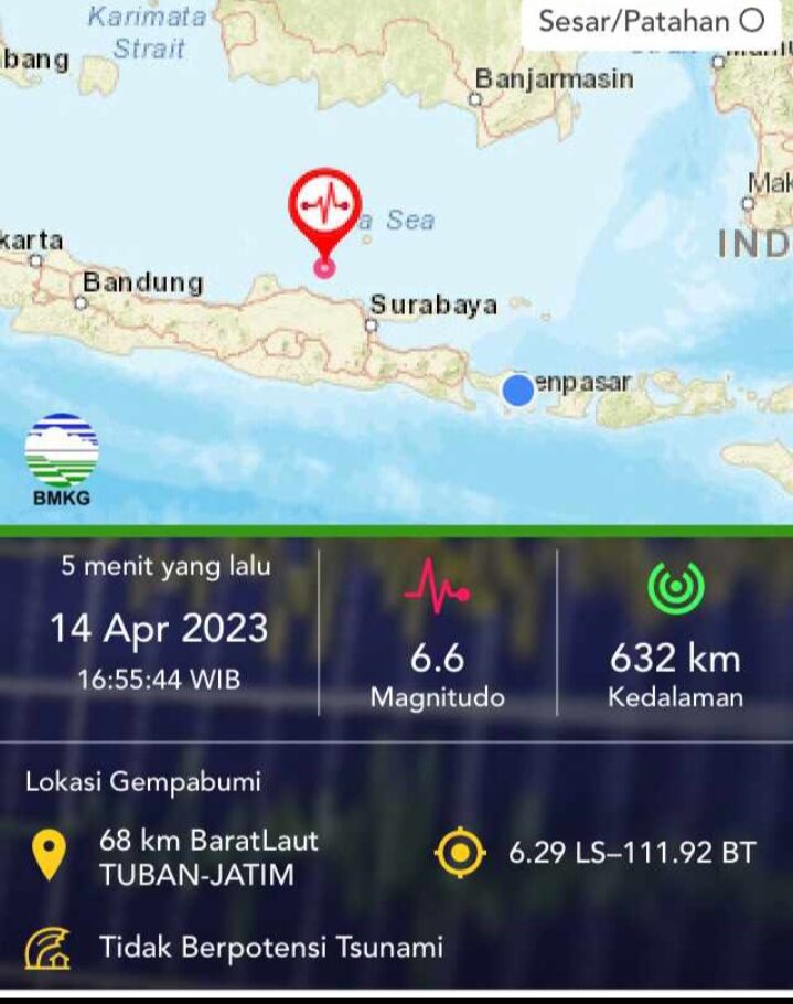 Gempa Berkekuatan 6,6 SR Terjadi di Jawa Timur tepatnya 68 km arah Barat Laut pada lokasi 6.29 LS,111.92 BT dengan kedalaman 632 Km.