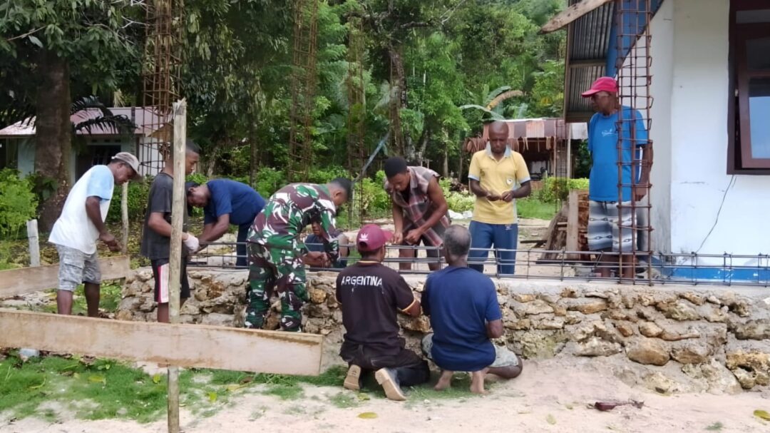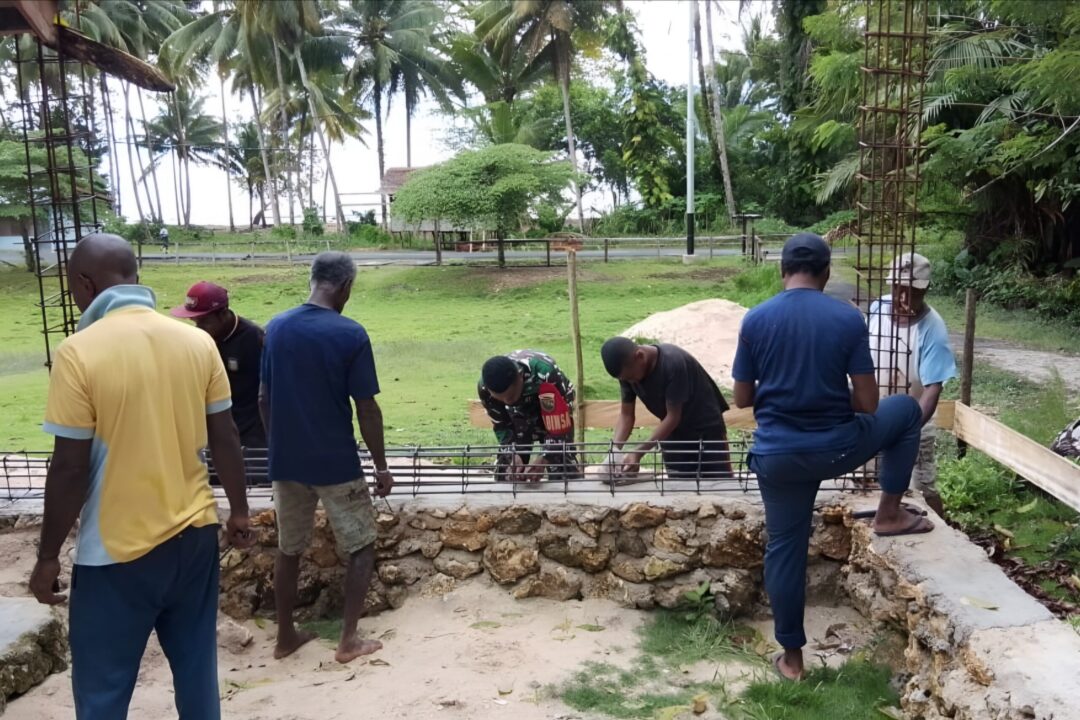 WARSA – Dalam semangat kebersamaan dan kepedulian terhadap kehidupan beragama, Babinsa Posramil 1708-02/Biak Utara-Warsa, Serda Jhon Rumere bersama warga jemaat Gereja Pekabaran Injil (GPI) Tiatira Warsa melaksanakan kegiatan gotong-royong memasang besi cor pondasi gereja di Kampung Imbari, Distrik Warsa, Kabupaten Biak Numfor, Papua, Rabu (8/10/2025).