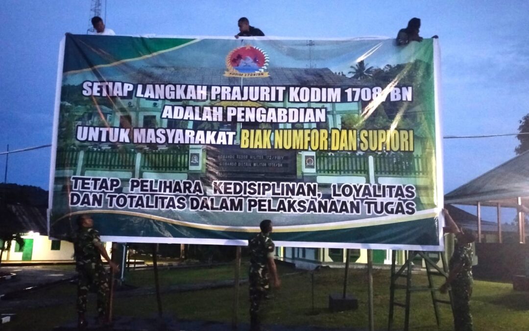 MOTIVASI: Anggota Kodim 1708/BN pasang banner motivasi di depan penjagaan Makodim 1708/BN, Jalan Majapahit, Kelurahan Brambaken, Distrik Samofa, Kabupaten Biak Numfor, Kamis (21/8/2025). (Foto: Penerangan Kodim 1708/BN)