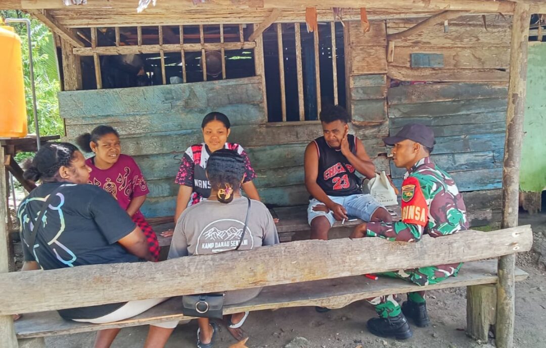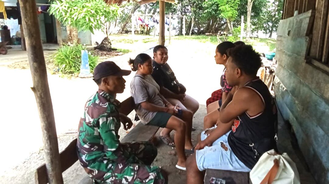 KOMSOS: Babinsa Koramil 1708-06/Supiori Utara, Serda Risman Mambrasar komsos dan menjalin silaturahmi dengan warga binaan di Kampung Fanjur, Distrik Supiori Utara, Kabupaten Supiori, Senin (5/1/2026). (Foto: Penerangan Kodim 1708/BN)