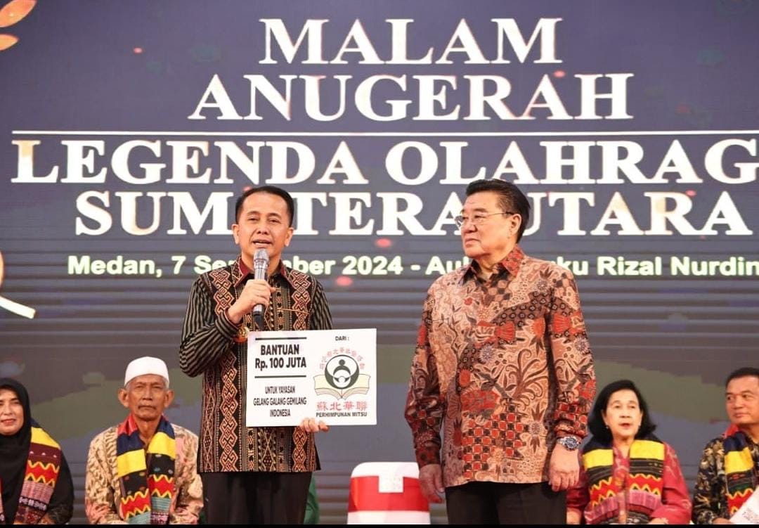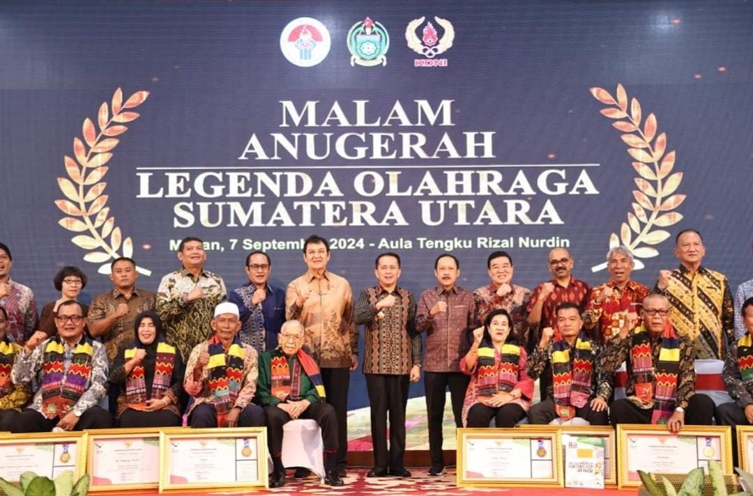 Sumut, Nirmedia – Penjabat (Pj) Gubernur Sumatera Utara (Sumut) Agus Fatoni memberikan penghargaan kepada legenda olahraga Sumut pada acara Malam Anugerah Legenda Olahraga Sumatera Utara. Kegiatan ini berlangsung di Aula Tengku Rizal Nurdin, Medan, Sumatera Utara, Sabtu (7/9/2024).