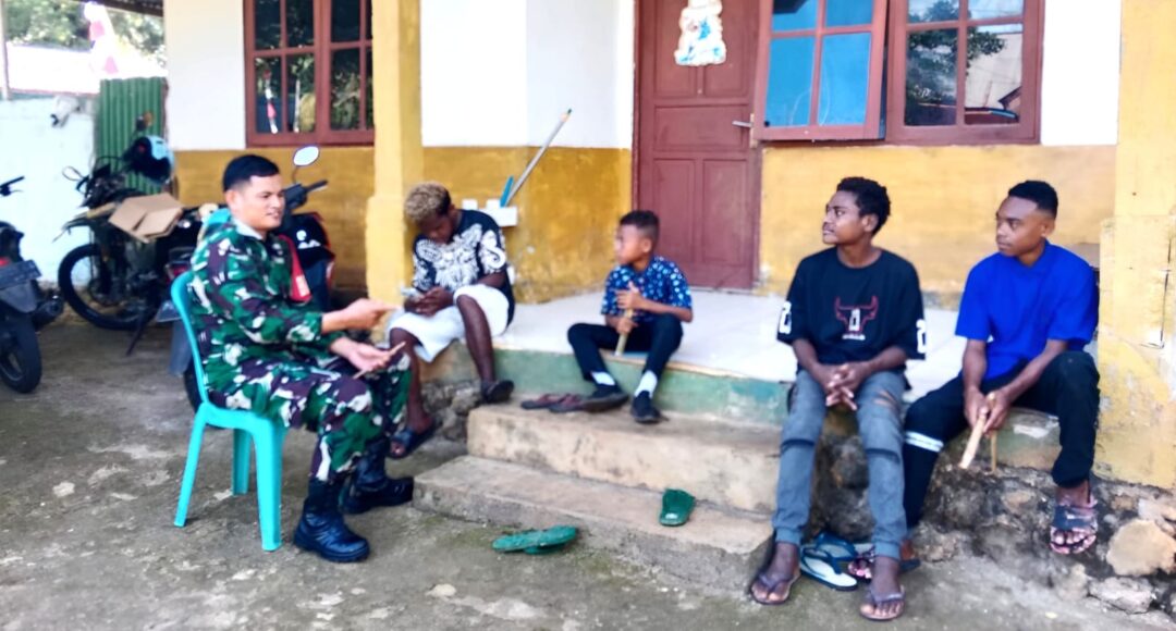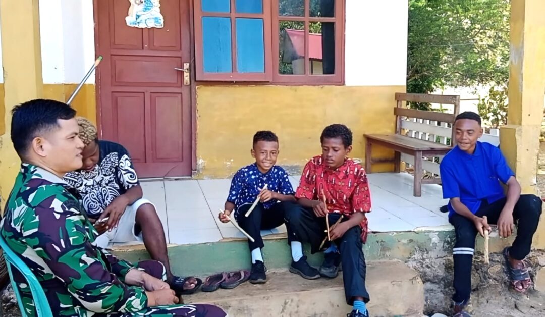 SUPIORI – Babinsa Koramil 1708-04/Supiori Selatan, Sertu Yunus Upa Rante memberikan motivasi kepada anak-anak di Kampung Wafor, Distrik Supiori Timur, Kabupaten Supiori, Papua, Jumat (27/3/2026).