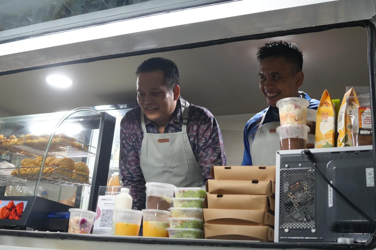 “Melalui food truck ini, kita melakukan strategi jemput bola. Ini adalah cara pemasaran yang kreatif, modern, dan yang terpenting, lebih dekat dengan warga. Kita ingin produk lokal Jembrana menjadi pilihan utama yang mudah dijangkau oleh masyarakat kita sendiri,” ujar Bupati Kembang saat mencoba langsung melayani warga dari atas unit food truck. (%)