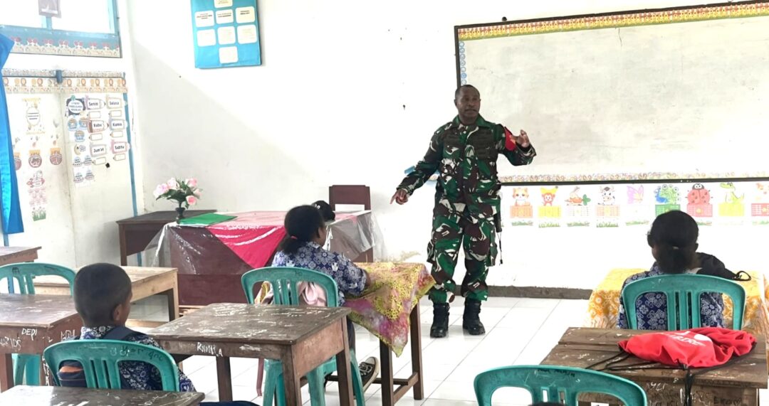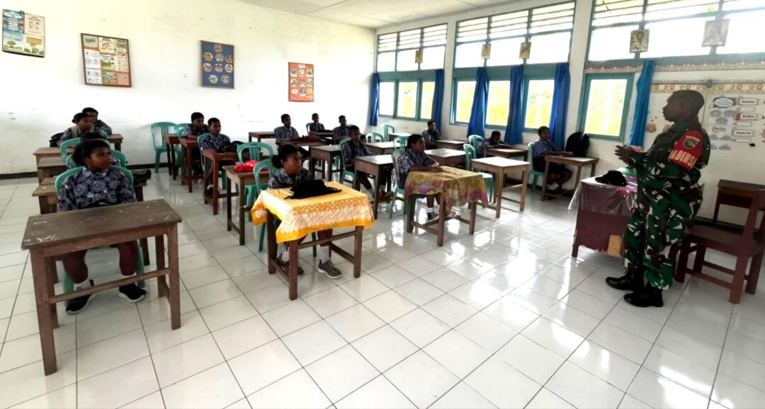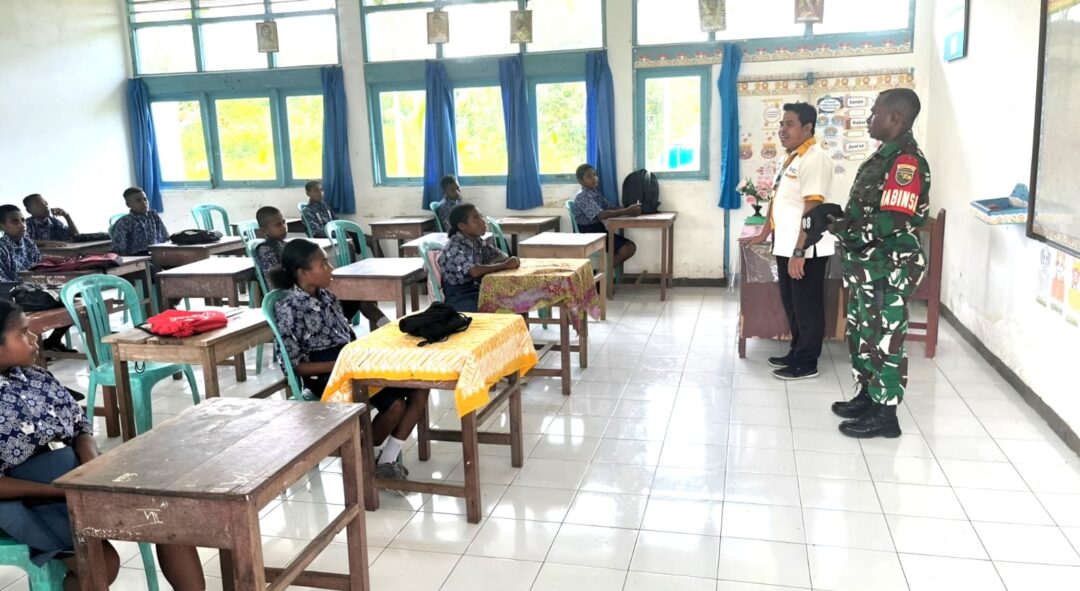 NUMFOR – Babinsa Koramil 1708-05/Numfor, Serka Frans Bonai memberikan materi wawasan kebangsaan (wasbang) kepada murid-murid kelas III SMPN 1 Numfor. Kegiatan ini dilaksanakan di Kampung Kansai, Distrik Numfor Barat, Kabupaten Biak Numfor, Papua, Kamis (15/1/2026).