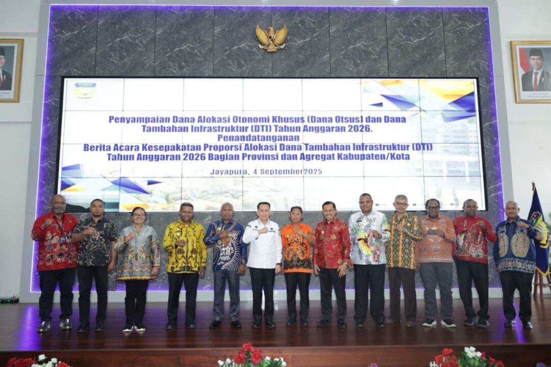 Jayapura – Pemerintah Provinsi (Pemprov) Papua bersama Bupati dan Wali Kota se-Papua resmi menandatangani nota kesepakatan proporsi alokasi Dana Otonomi Khusus (Otsus dan Dana Tambahan Infrastruktur (DTI) Tahun Anggaran 2026. Kegiatan ini berlangsung di Lukmen Hall, Gedung Negara, Jayapura, Papua, Kamis (04/09/2025).