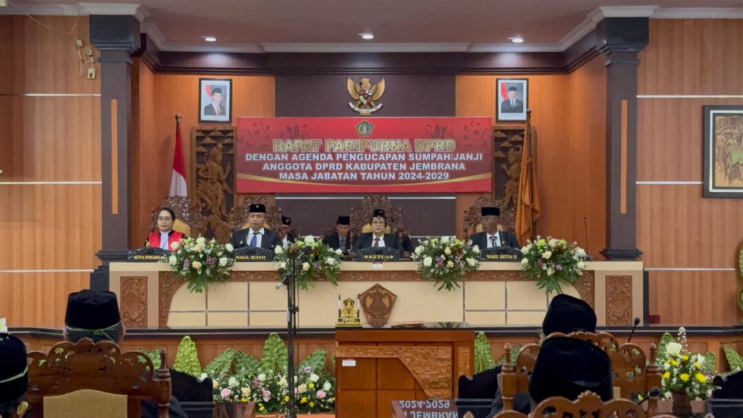 JEMBRANA, nirmedia.co – Sebanyak 35 Anggota Dewan Perwakilan Rakyat Daerah (DPRD) Kabupaten Jembrana untuk periode 2024-2029 secara resmi diambil sumpah/janji jabatan dalam sebuah upacara yang digelar di Ruang Sidang Paripurna DPRD Kabupaten Jembrana, Selasa, 13 Agustus 2024.