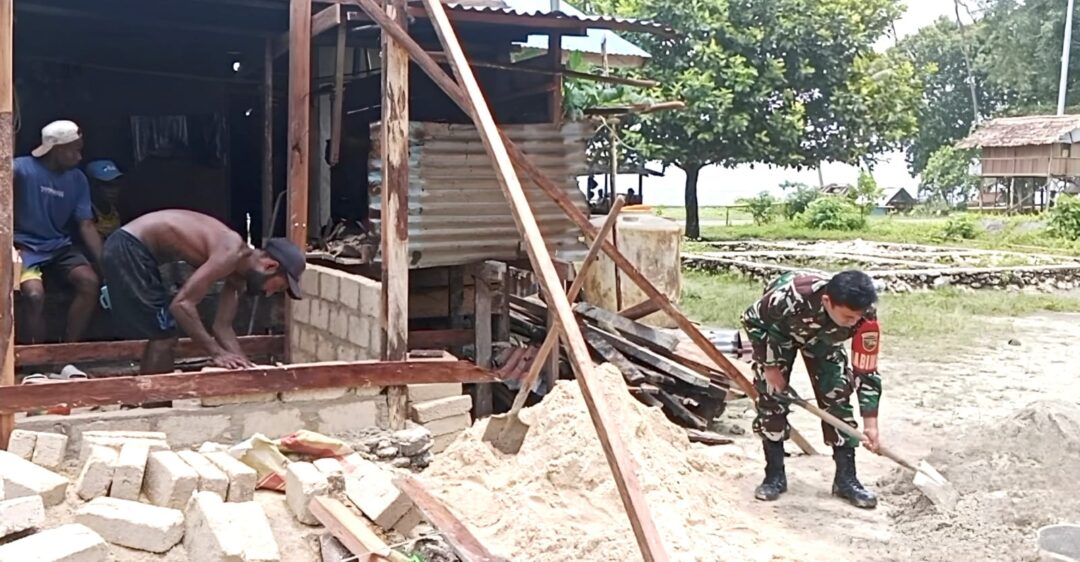 WARSA – Babinsa Posramil 1708-02/Biak Utara-Warsa Serma Dwi Wahyudi membantu warga membangun MCK (mandi, cuci, kakus) di Kampung Inswanbesi Sup, Distrik Warsa, Kabupaten Biak Numfor, Papua, Kamis (5/3/2026).