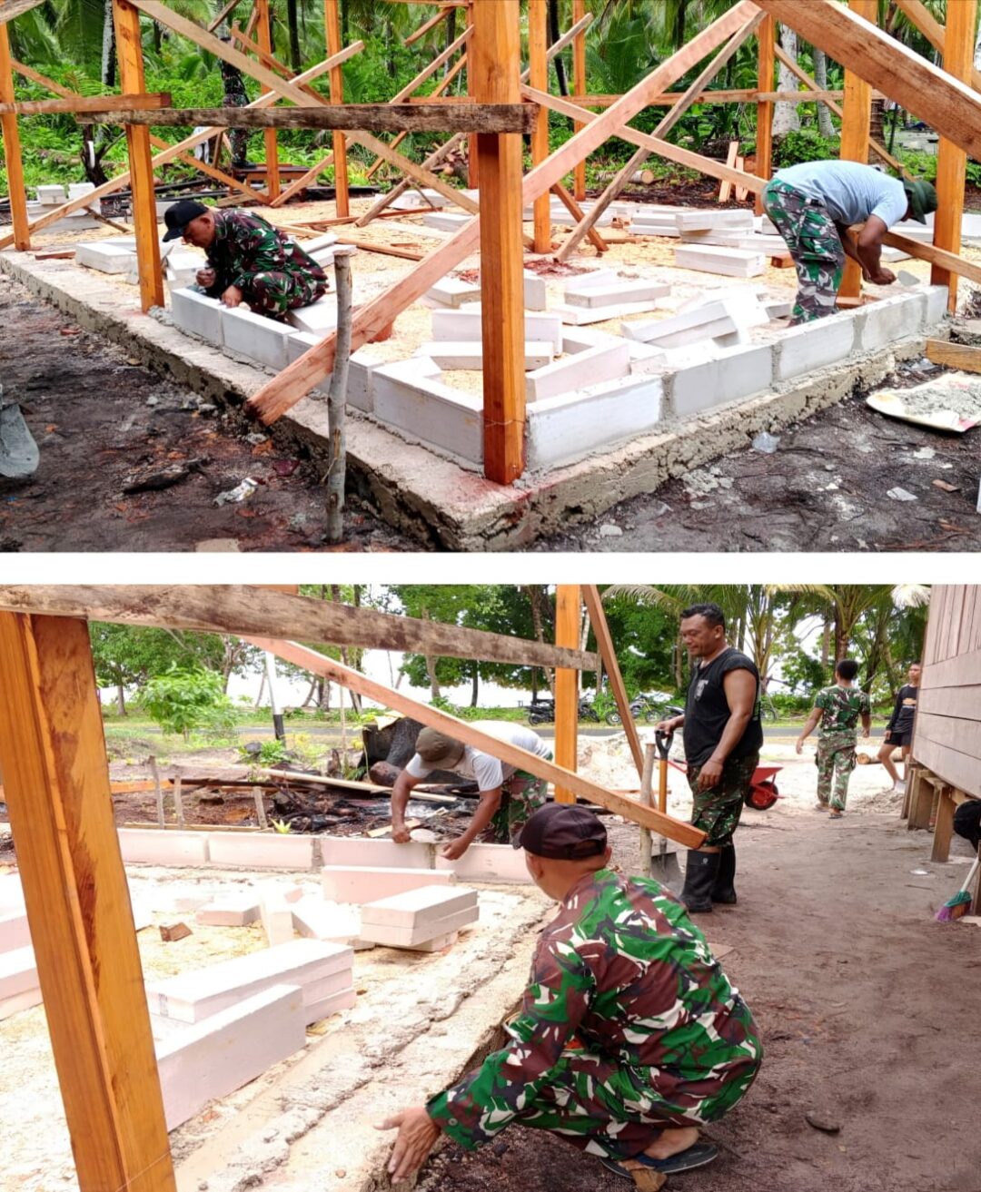 Di lokasi, personel Satgas TMMD tampak terus bekerja dengan penuh semangat. Mereka saling bahu-membahu agar pembangunan rumah bisa selesai tepat waktu dan segera bisa digunakan oleh warga penerima manfaat.
