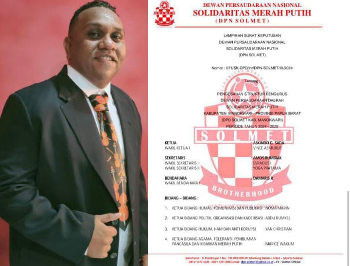 Manokwari, Nirmedia – Askino akhirnya resmi terima SK sebagai ketua DPD Solidaritas merah putih(Solmet) manokwari papua barat, SK tersebut telah sah turun dari pusat pada 02 September 2024, kepada Askino G Sada, sebagai ketua DPD Solmet Manokwari.