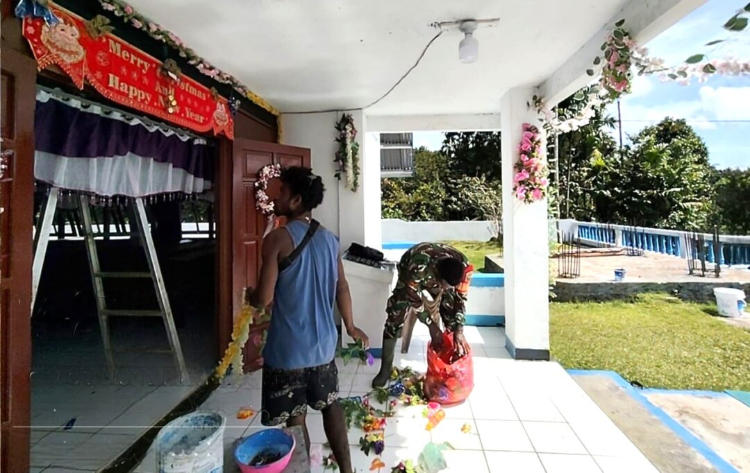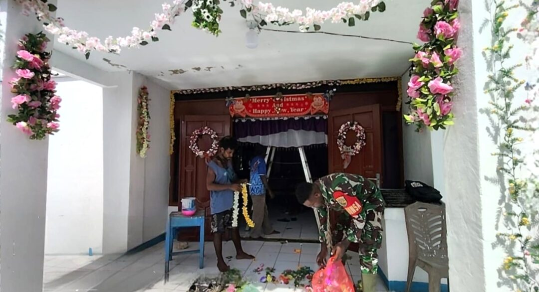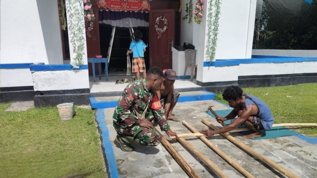 BIAK BARAT – Babinsa Koramil 1708-03/Biak Barat, Pratu Omi Weya turun langsung bersama warga Kampung Yomdori melaksanakan karya bakti menghias gereja dalam rangka menyambut perayaan Natal di Distrik Biak Barat, Kabupaten Biak Numfor, Papua, Kamis (11/12/2025).