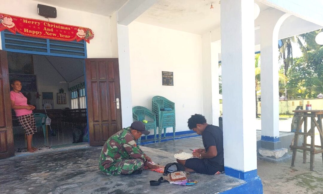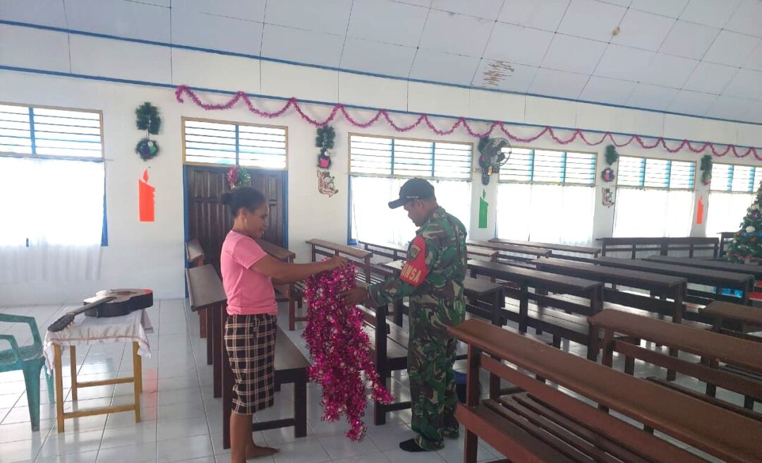 SUPIORI BARAT – Babinsa Koramil 1708-06/Supiori Barat, Koptu Imanuel Rumere membantu warga masyarakat Kampung Amyas mendekorasi gedung gereja persiapan ibadah Malam Kudus dan perayaan Natal di Kampung Amyas, Distrik Supiori Barat, Kabupaten Supiori, Papua, Selasa (23/12/2025).