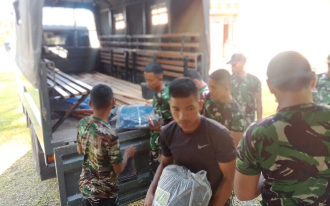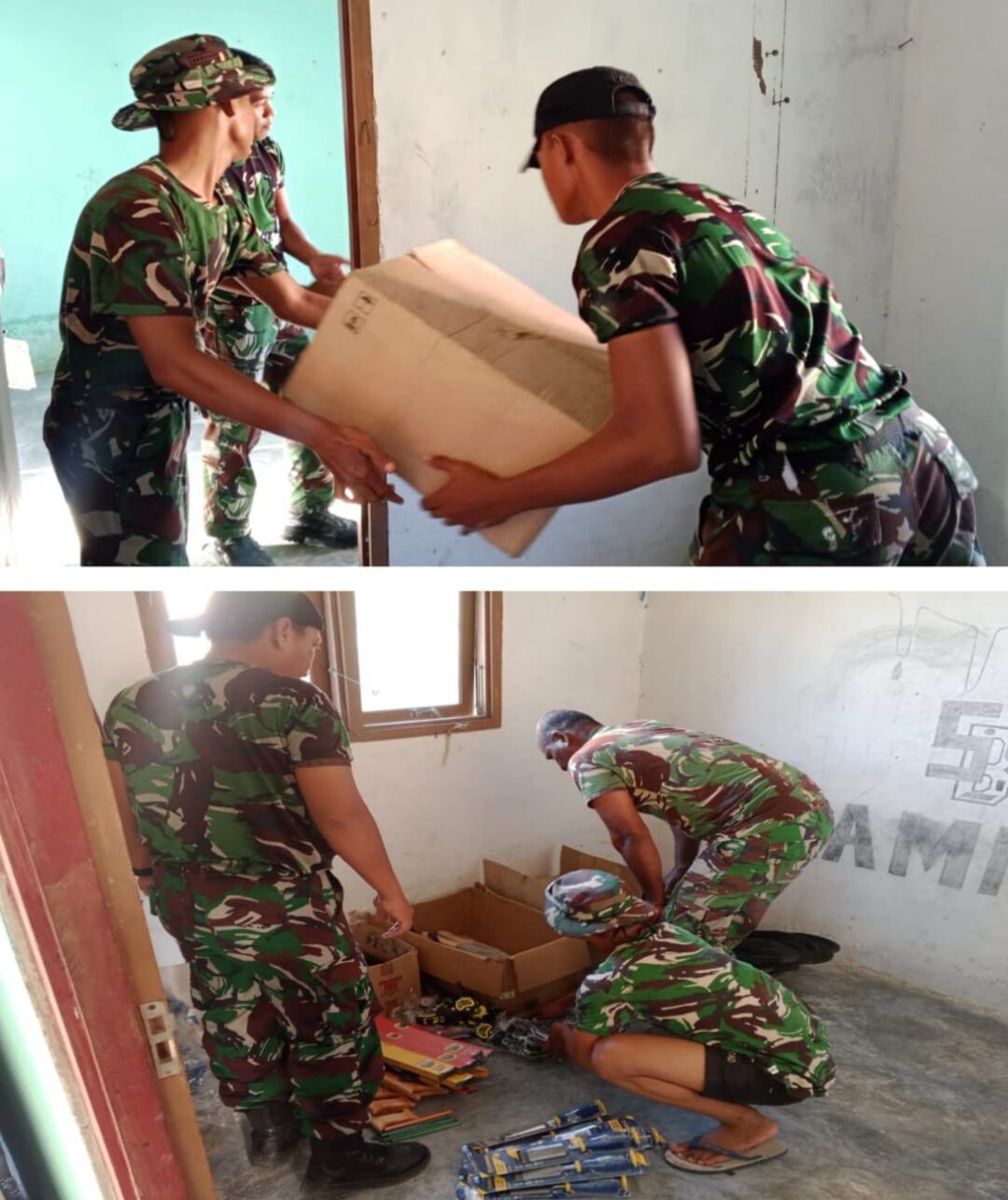 Dalam kegiatan tersebut, personel Satgas TMMD terlihat membongkar dan menata berbagai perlengkapan kerja yang baru didatangkan, mulai dari alat pertukangan seperti palu, pahat, meteran, linggis, skop, hingga perlengkapan pendukung lainnya yang akan digunakan dalam proses pembangunan rumah warga.