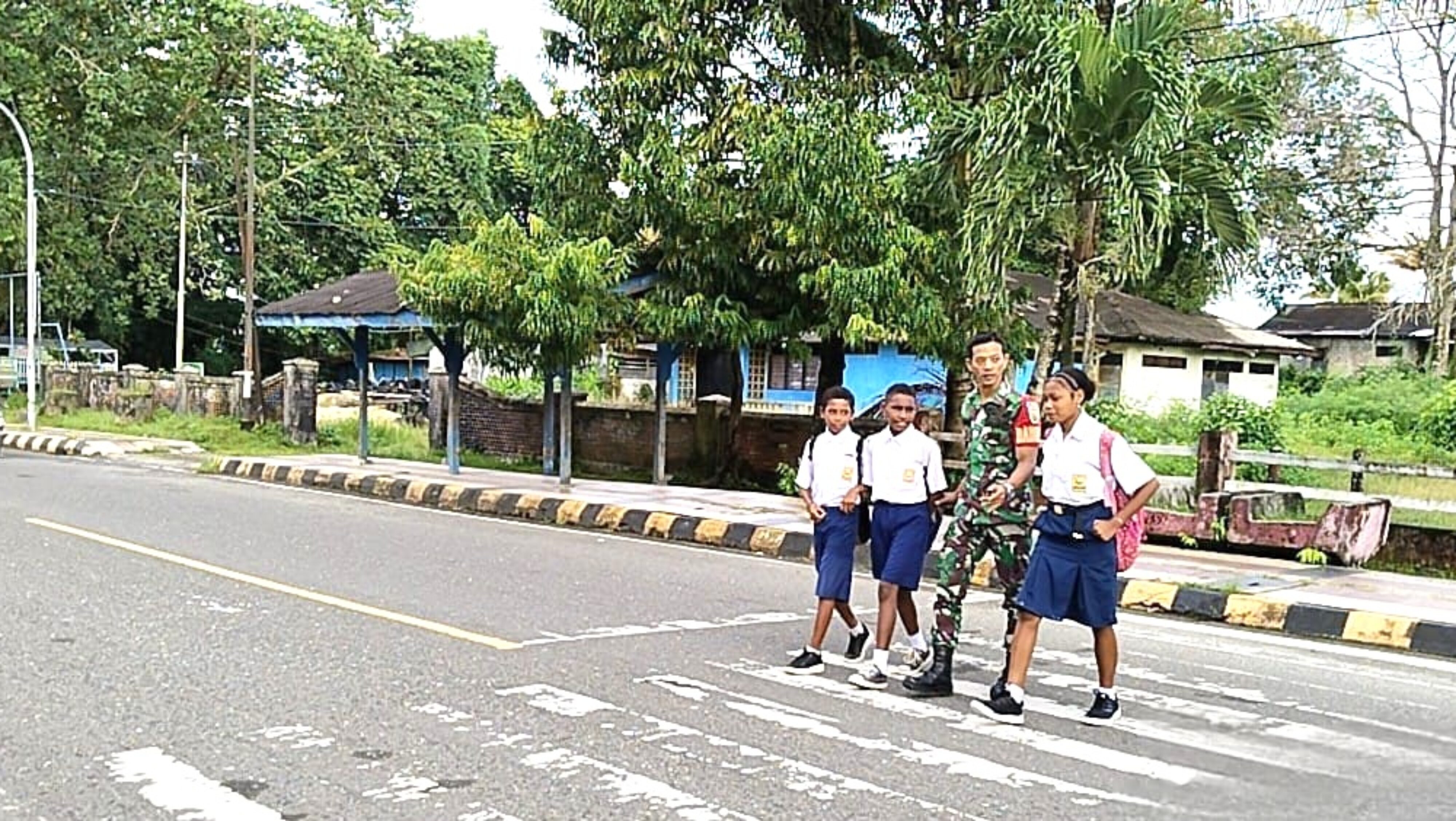 BIAK – Babinsa Koramil 1708-01/Biak Kota, Serka Mudho Wibowo dan Serka Sriyono membantu menyeberangkan anak-anak…