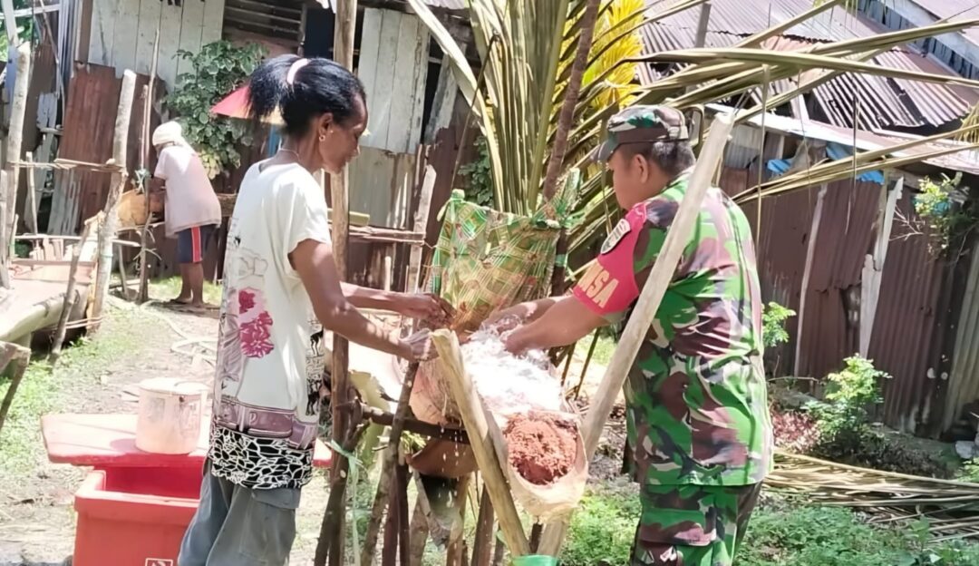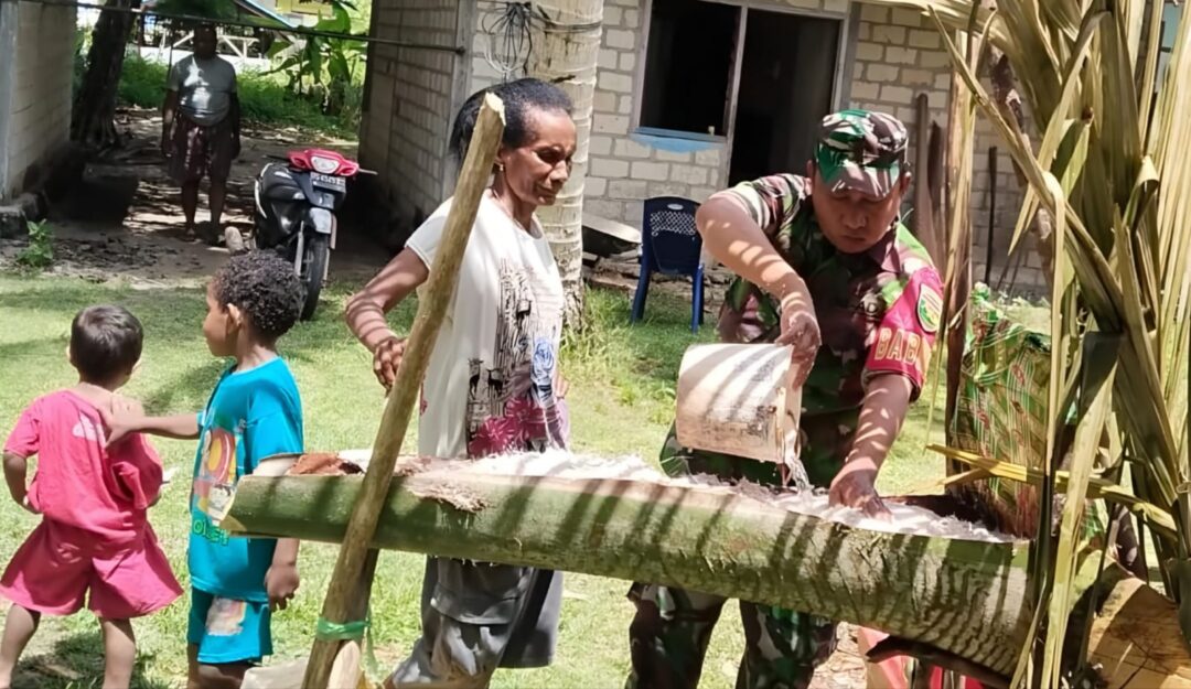 SUPIORI – Sebagai bentuk nyata kedekatan TNI dengan masyarakat, Serka Agustinus Ganna, Babinsa Koramil 1708-06/Supiori Utara membantu salah satu warga binaan proses pengolahan sagu di Kampung Warsa, Distrik Supiori Utara, Kabupaten Supiori, Papua, Senin (1/9/2025).