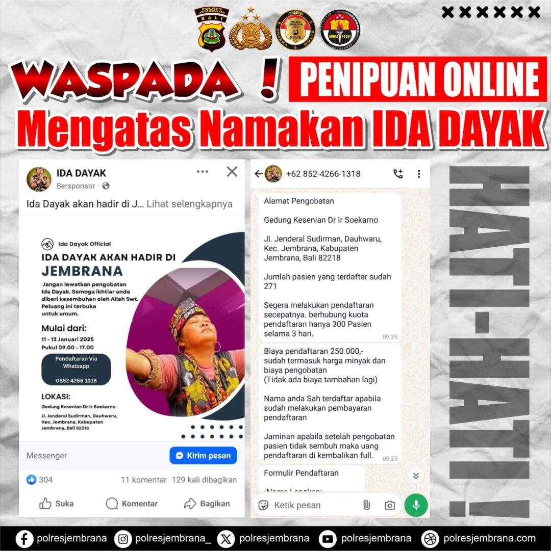 Dugaan modus penipuan melalui penyebaran brosur pengobatan Ida Dayak di medsos itu diperkuat dengan keterangan dari Kasat Reskrim Polres Jembrana AKP Si Ketut Arya Pinatih.