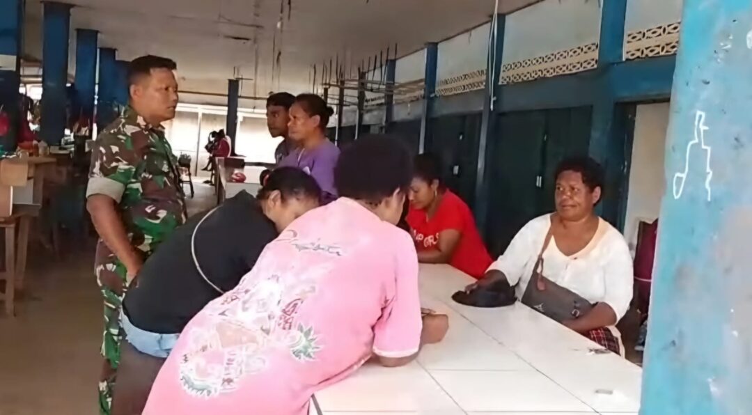 BIAK UTARA – Babinsa Koramil 1708-02/Biak Utara, Serka Asmaejar melaksanakan komunikasi sosial (komsos) bersama mama-mama yang sedang duduk santai di lingkungan Pasar Korem, Distrik Biak Utara, Kabupaten Biak Numfor, Papua, Minggu (31/8/2025).