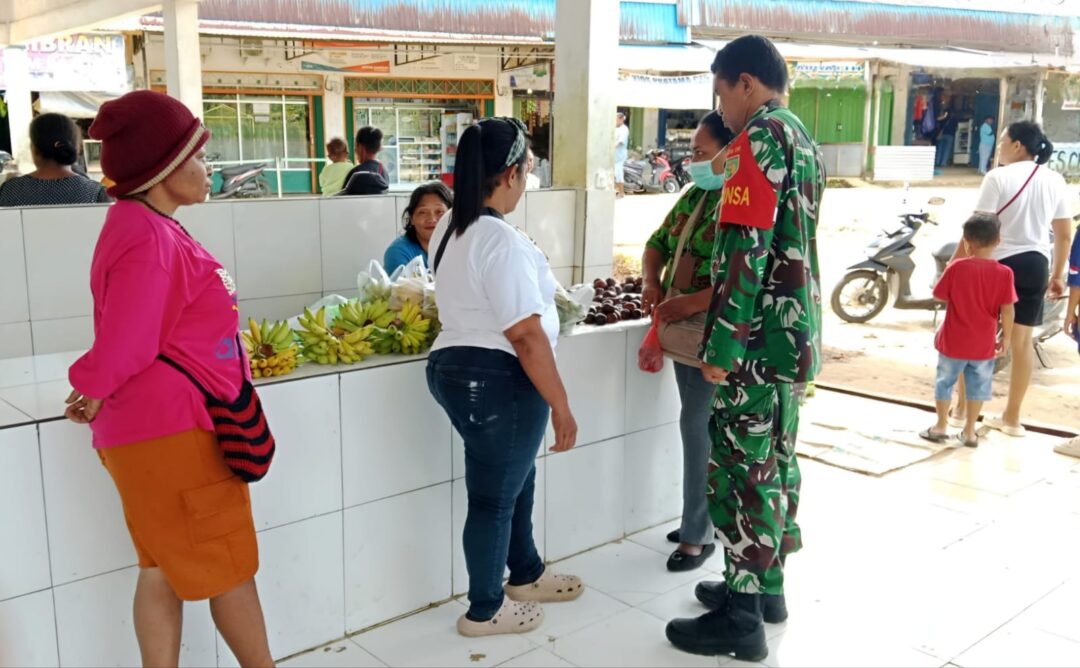 Babinsa berkeliling menyapa pedagang satu per satu memastikan suasana pasar tetap aman . (Foto : Penerangan Kodim 1708/BN)